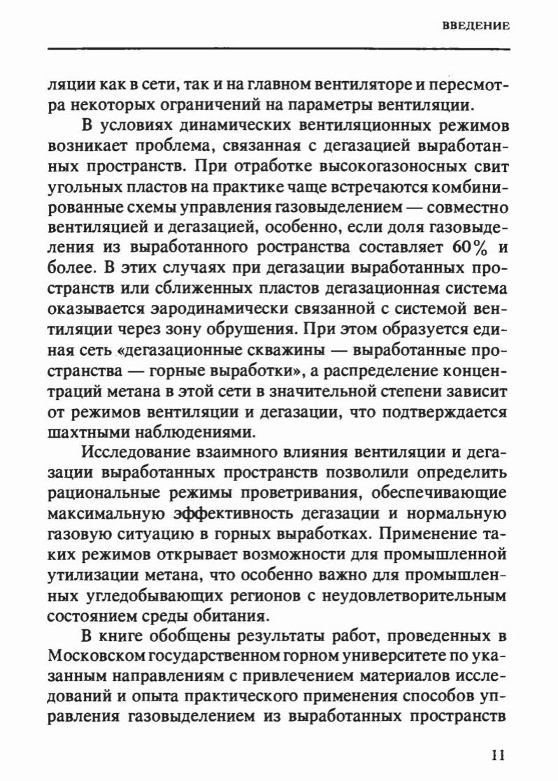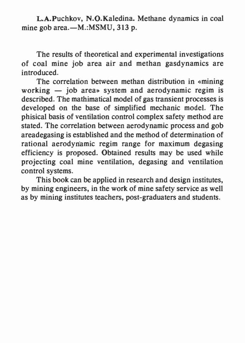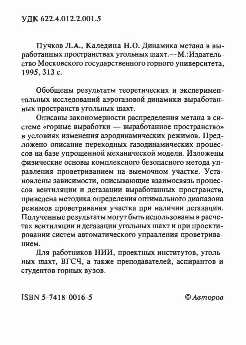 Обобщены результаты теоретических и экспериментальных исследований аэрогазовой динамики выработанных пространств угольных шахт. Описаны закономерности распределения метана в системе "горные выработки - выработанное пространство" в условиях изменения аэродинамических режимов. Предложено описание переходных газодинамических процессов на базе упрощённой механической модели. Изложены физические основы комплексного безопасного метода управления проветриванием на выемочном участке. Установлены зависимости, описывающие взаимосвязь процессов вентиляции и дегазации выработанных пространств, привелена методика определенияоптимального диапазона режимов провентривания участка при наличии дегазации. Полученные результаты могут быть использованы в расчетах вентиляции и дегазации угольных шахт и при проектировании систем автоматического управления проветриванием. Для работников НИИ, проектных институтов, угольных шахт, ВГСЧ, а также преподавателей, аспирантов и студентов горных вузов.