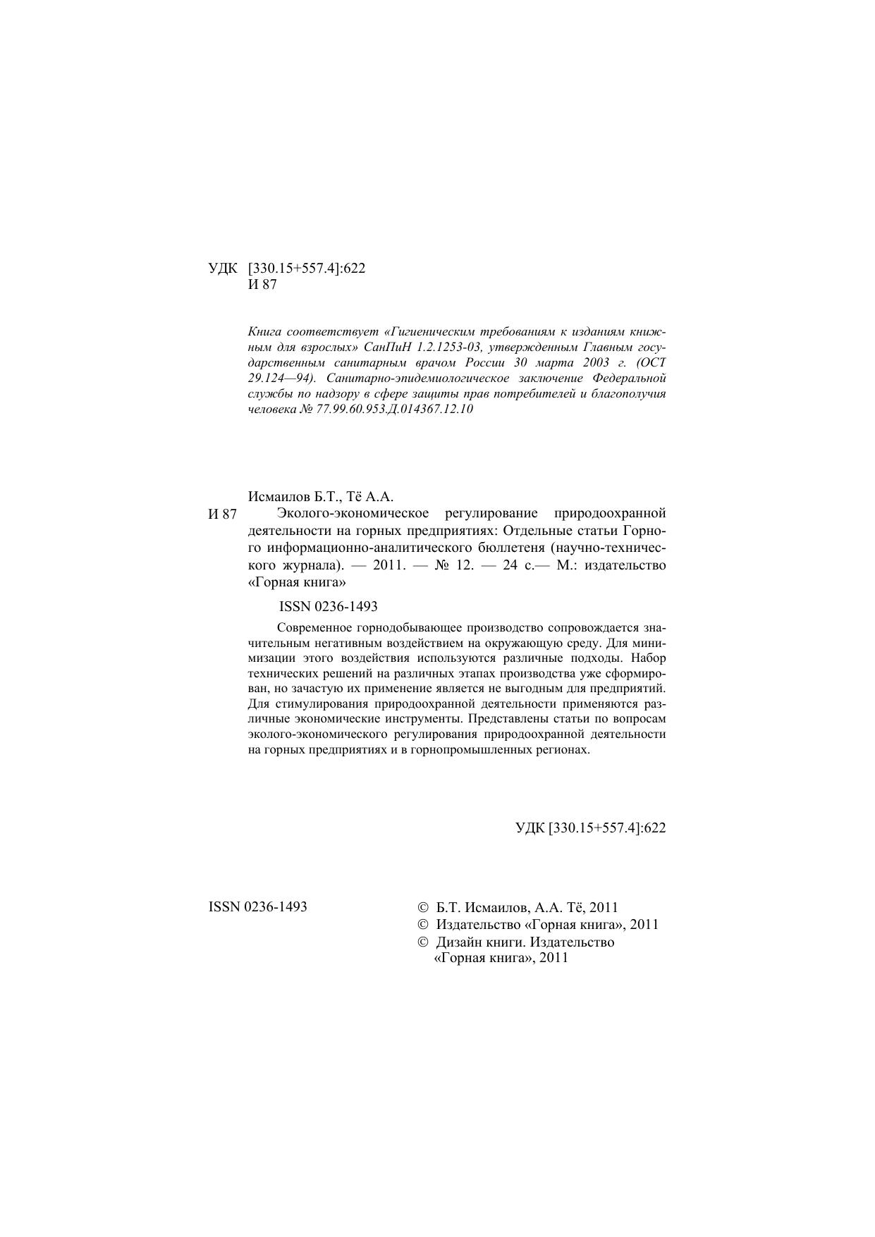 Современное горнодобывающее производство сопровождается значительным негативным воздействием на окружающую среду. Для минимизации этого воздействия используются различные подходы. Набор технических решений на различных этапах производства уже сформирован, но зачастую их применение является не выгодным для предприятий. Для стимулирования природоохранной деятельности применяются различные экономические инструменты. Представлены статьи по вопросамэколого-экономического регулирования природоохранной деятельности на горных предприятиях и в горнопромышленных регионах.