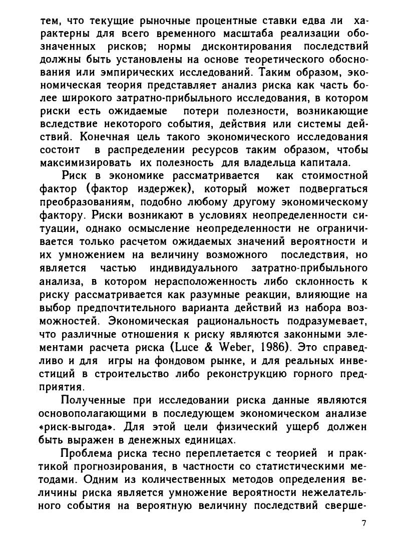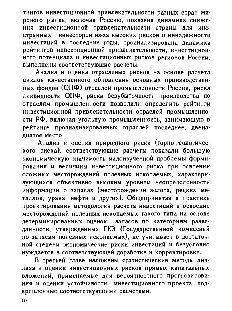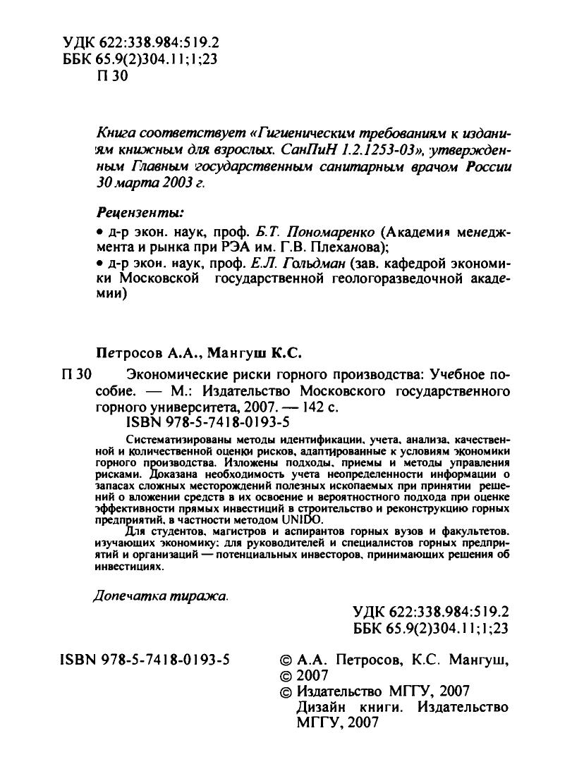 Систематизированы методы идентификации, учета, анализа, качественной и количественной оценки рисков, адаптированные к условиям экономики горного производства. Изложены подходы, приемы и методы управления рисками. Доказана необходимость учета неопределенности информации о запасах сложных месторождений полезных ископаемых при принятии решений о вложении средств в их освоение и вероятностного подхода при оценке эффективности прямых инвестиций в строительство и реконструкцию горных предприятий, в частности методом UNIDO. Для студентов, магистров и аспирантов горных вузов и факультетов, изучающих экономику для руководителей и специалистов горных предприятий и организаций ? потенциальных инвесторов, принимающих решения об инвестициях.