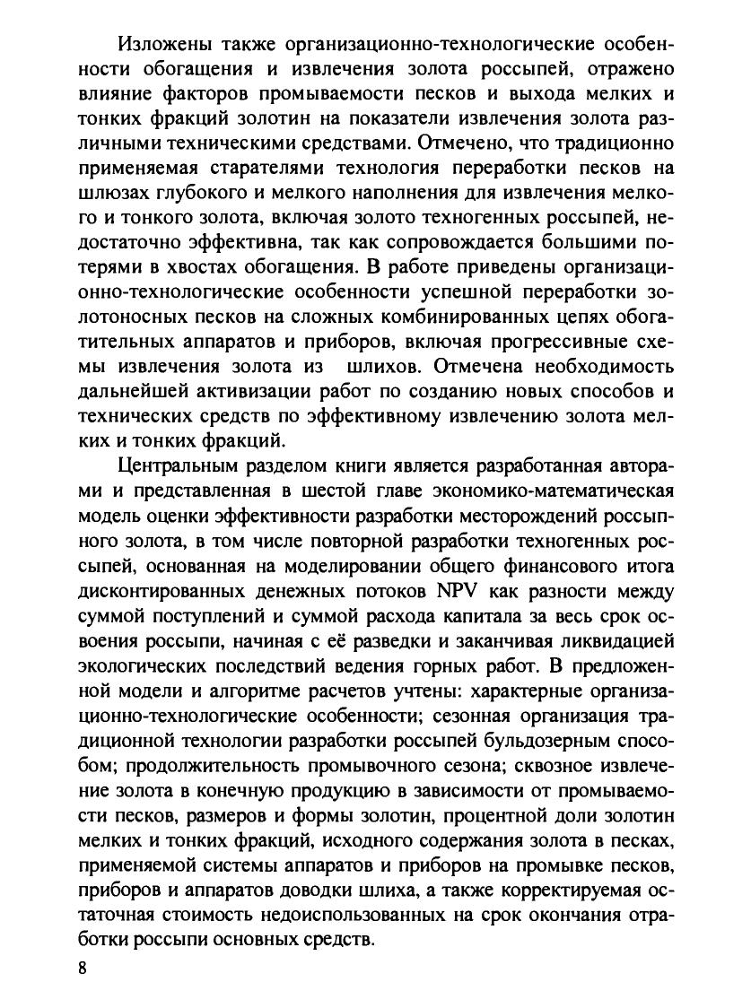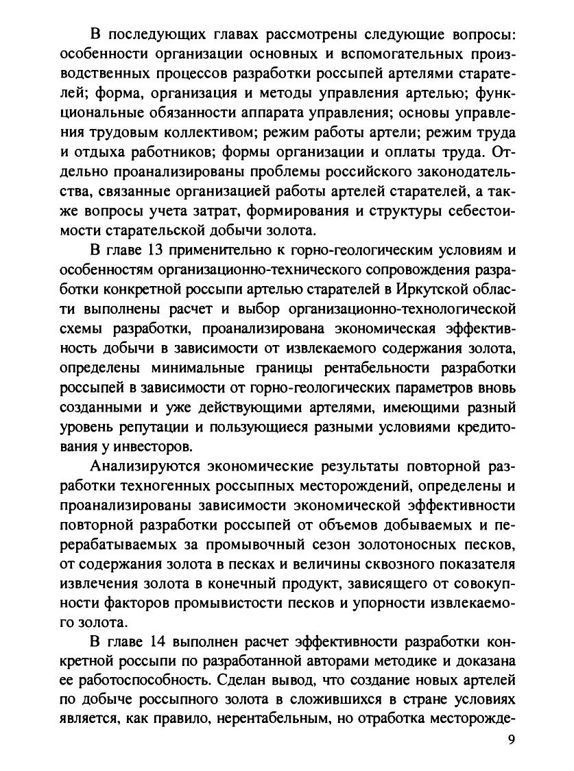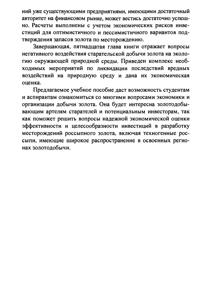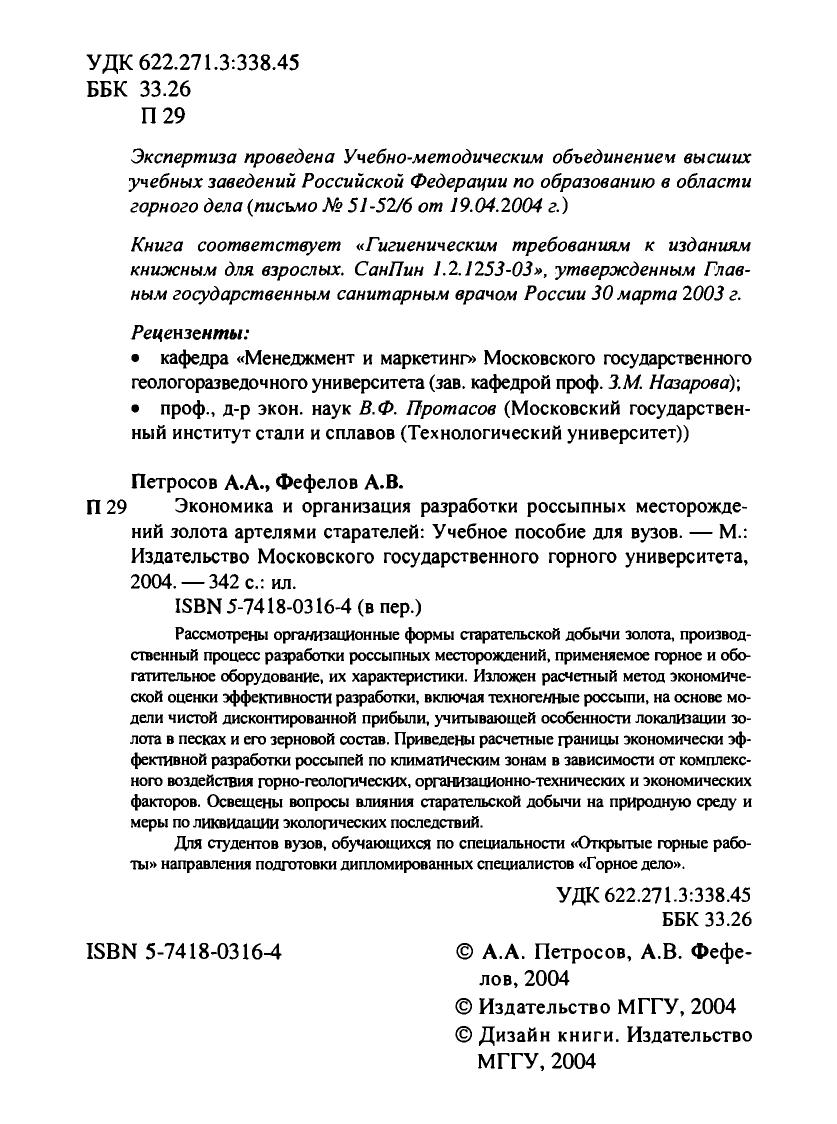 Рассмотрены организационные формы старательской добычи золота, производственный процесс разработки россыпных месторождений, применяемое горное и обогатительное оборудование, их характеристики. Изложен расчетный метод экономической оценки эффективности разработки, включая техногенные россыпи, на основе модели чистой дисконтированной прибыли, учитывающей особенности локализации золота в песках и его зерновой состав. Приведены расчетные границы экономически эффективной разработки россыпей по климатическим зонам в зависимости от комплексного воздействия горно-геологических, организационно-технических и экономических факторов. Освещены вопросы влияния старательской добычи на природную среду и меры по ликвидации экологических последствий. Дня студентов вузов, обучающихся по специальности «Открытые горные работы» направления подготовки дипломированных специалистов «Горное дело».