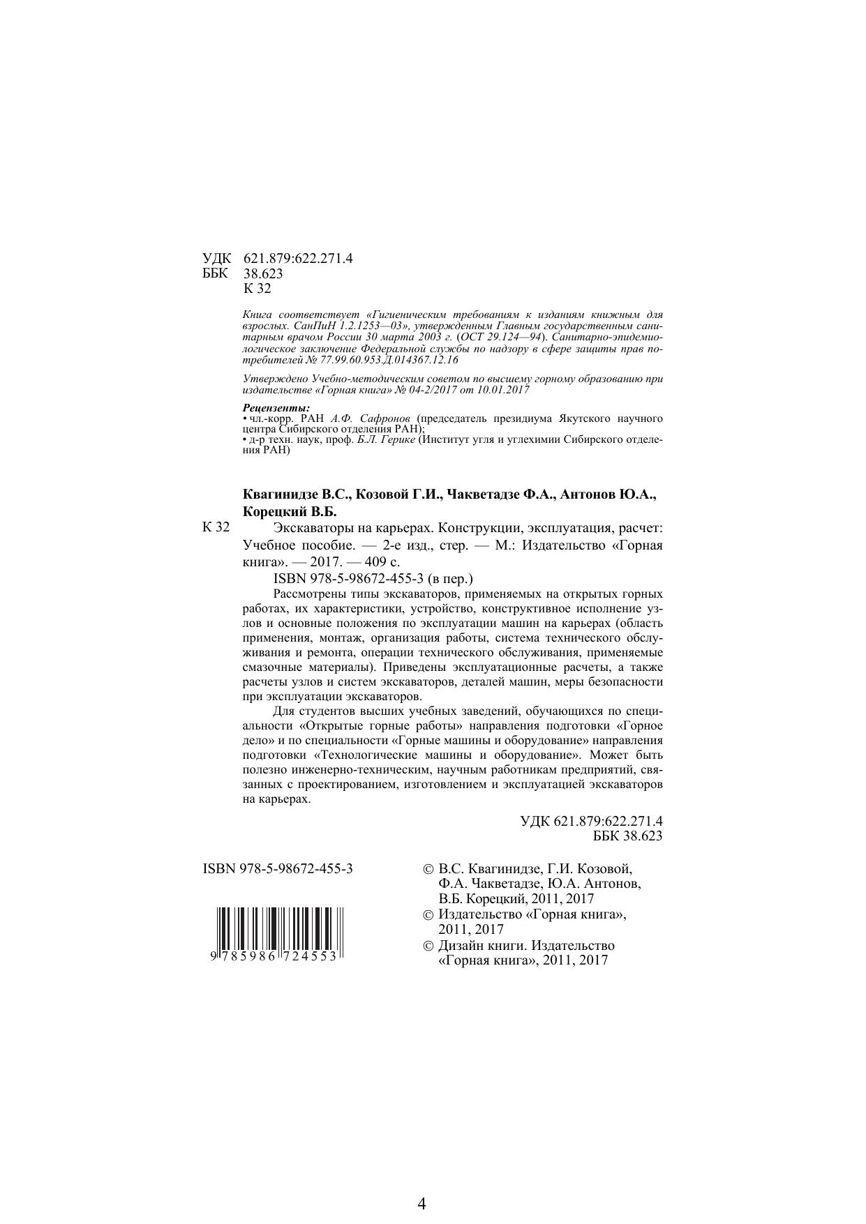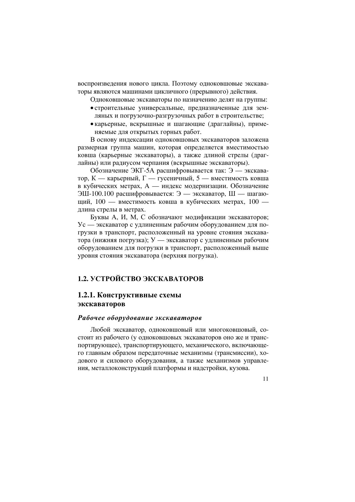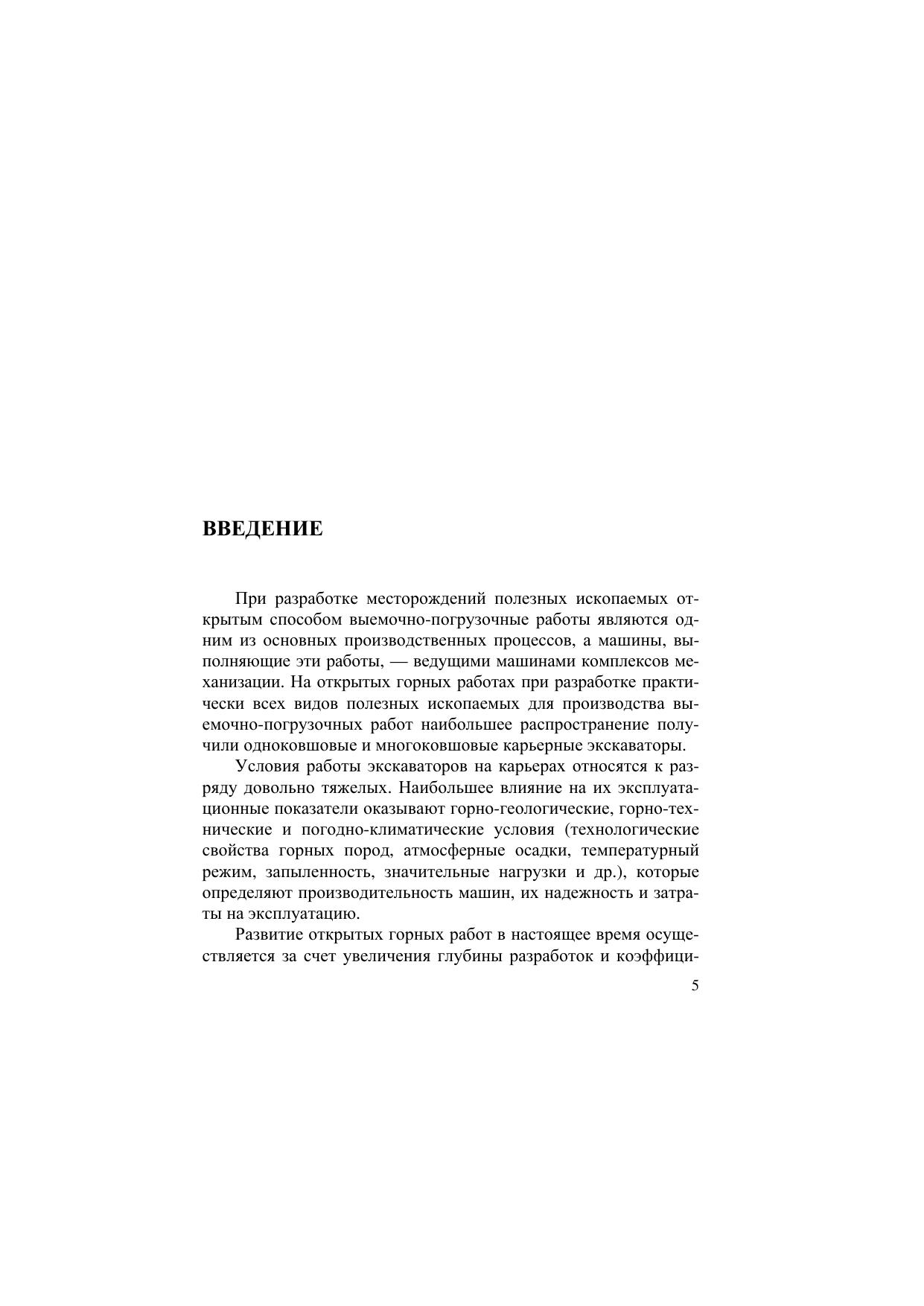 Рассмотрены типы экскаваторов, применяемых на открытых горных работах, их характеристики, устройство, конструктивное исполнение узлов и основные положения по эксплуатации машин на карьерах (область применения, монтаж, организация работы, система технического обслуживания и ремонта, операции технического обслуживания, применяемые смазочные материалы). Приведены эксплуатационные расчеты, а также расчеты узлов и систем экскаваторов, деталей машин, меры безопасности при эксплуатации экскаваторов. Для студентов высших учебных заведений, обучающихся по специальности «Открытые горные работы» направления подготовки «Горное дело» и по специальности «Горные машины и оборудование» направления подготовки «Технологические машины и оборудование». Может быть полезно инженерно-техническим, научным работникам предприятий, связанных с проектированием, изготовлением и эксплуатацией экскаваторов на карьерах.