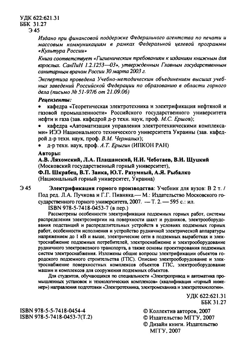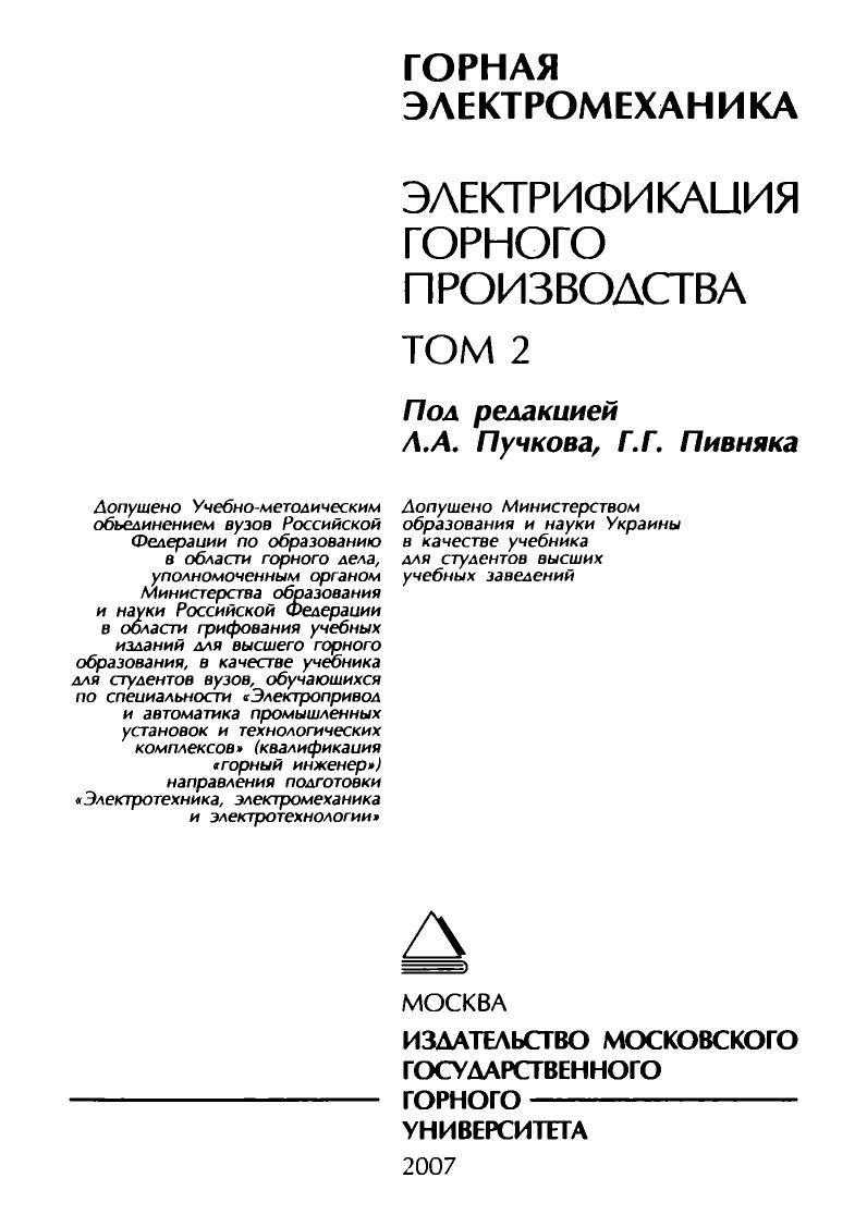 Гриф: Допушено Учебно-метсмнческим обьединеним вузов Российской Федерации по образованию в области горного дела, уполномоченным органом Министерства образования н науки Российской Федерации в области грифовання учебных изданнй для высшего горного образования, в качестве учебника для студентов вузов, обучаюшнхся по специальности "Электропривод и автоматика промышленных установок н технологических комплексов" (квалификация "горный инженер") направления подготовки "Электротехника, электромеханика и электротехнологии"