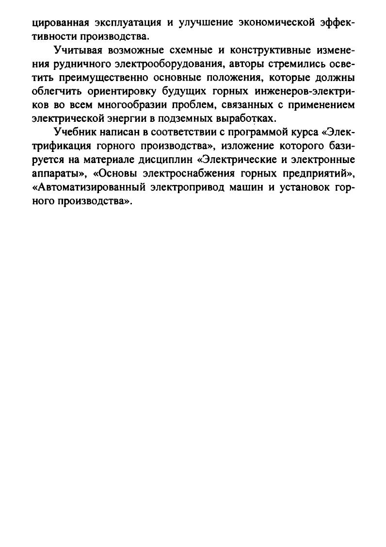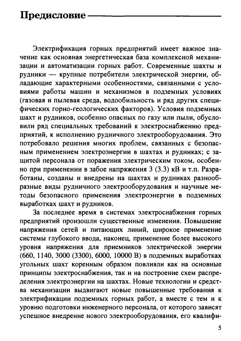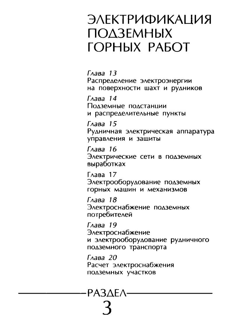 Рассмотрены особенности электрификации подземных горных работ, системы распределения электроэнергии на поверхности шахт и рудников, электрооборудования подстанций и распределительных устройств в условиях подземных горных работ, особенности исполнения и устройство рудничной электрической аппаратуры напряжением до 1 кВ и выше, электрические сети в подземных выработках и электроснабжение подземных потребителей, электроснабжение и электрооборудование рудничного электровозного транспорта, а также основы проектирования подземных систем электроснабжения. Изложены общие вопросы электрификации объектов городского подземного строительства (ГПС). Описано электрооборудование и электроснабжение поверхностных комплексов объектов ГПС, электрооборудование машин и комплексов для сооружения подземных объектов. Для студентов, обучающихся по специальности «Электропривод и автоматика промышленных установок и технологических комплексов» (квалификация «горный инженер») направления подготовки «Электротехника, электромеханика и электротехнологии».