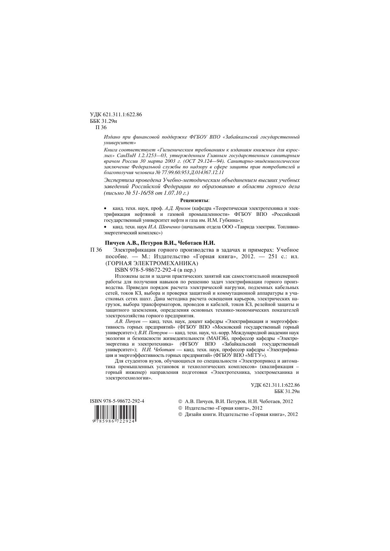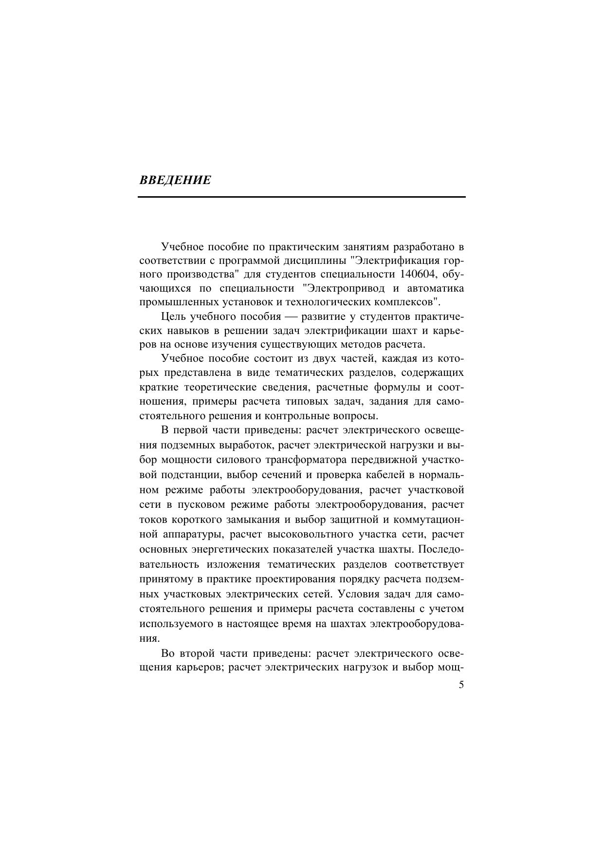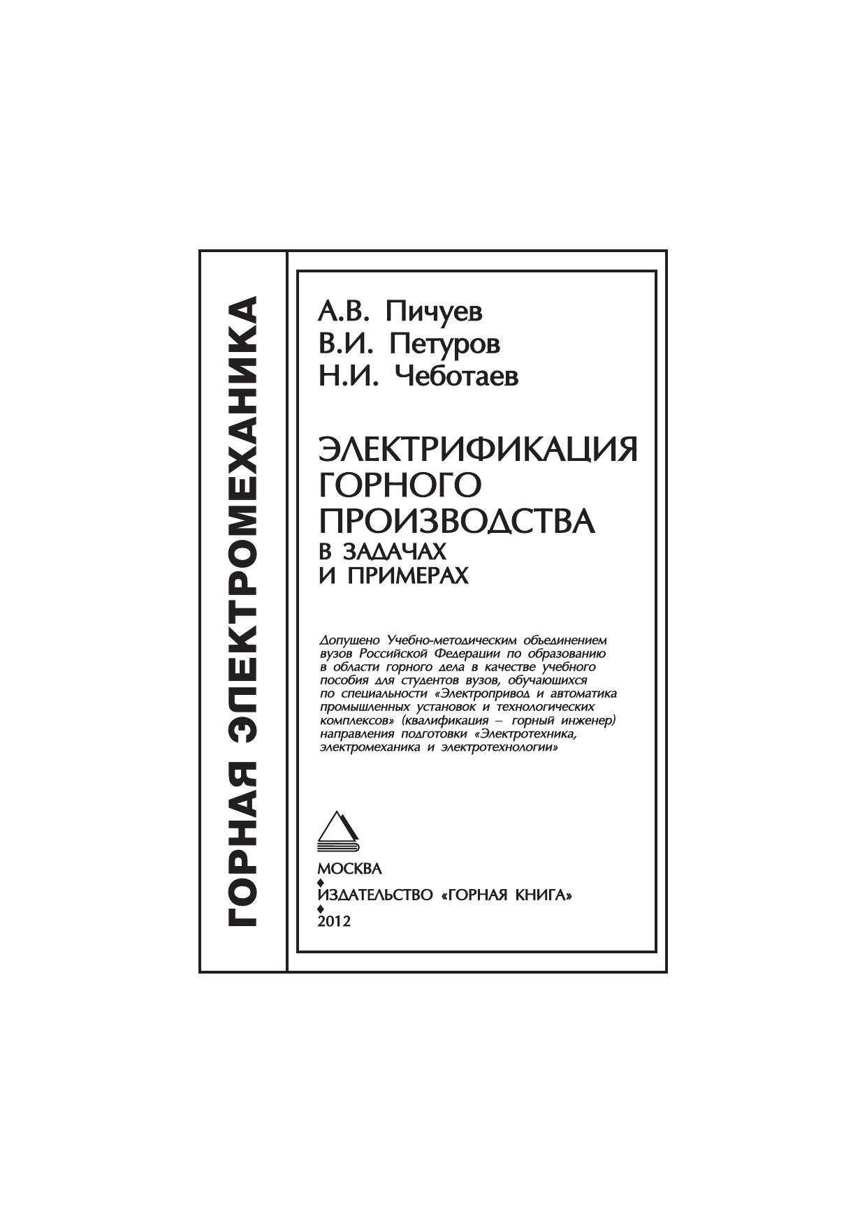 Изложены цели и задачи практических занятий как самостоятельной инженерной работы для получения навыков по решению задач электрификации горного производства. Приведен порядок расчета электрической нагрузки, подземных кабельных сетей, токов КЗ, выбора и проверки защитной и коммутационной аппаратуры в участковых сетях шахт. Дана методика расчета освещения карьеров, электрических нагрузок, выбора трансформаторов, проводов и кабелей, токов КЗ, релейной защиты и защитного заземления, определения основных технико-экономических показателей электрохозяйства горного предприятия. А.В. Пичуев — канд. техн. наук, доцент кафедры «Электрификация и энергоэффективность горных предприятий» (ФГБОУ ВПО «Московский государственный горный университет»); В.И. Петуров — канд. техн. наук, чл.-корр. Международной академии наук экологии и безопасности жизнедеятельности (МАНЭБ), профессор кафедры «Электро-энергетика и электротехника» (ФГБОУ ВПО «Забайкальский государственный университет»); Н.И. Чеботаев — канд. техн. наук, профессор кафедры «Электрификация и энергоэффективность горных предприятий» (ФГБОУ ВПО «МГГУ»). Для студентов вузов, обучающихся по специальности «Электропривод и автоматика промышленных установок и технологических комплексов» (квалификация – горный инженер) направления подготовки «Электротехника, электромеханика и электротехнологии».