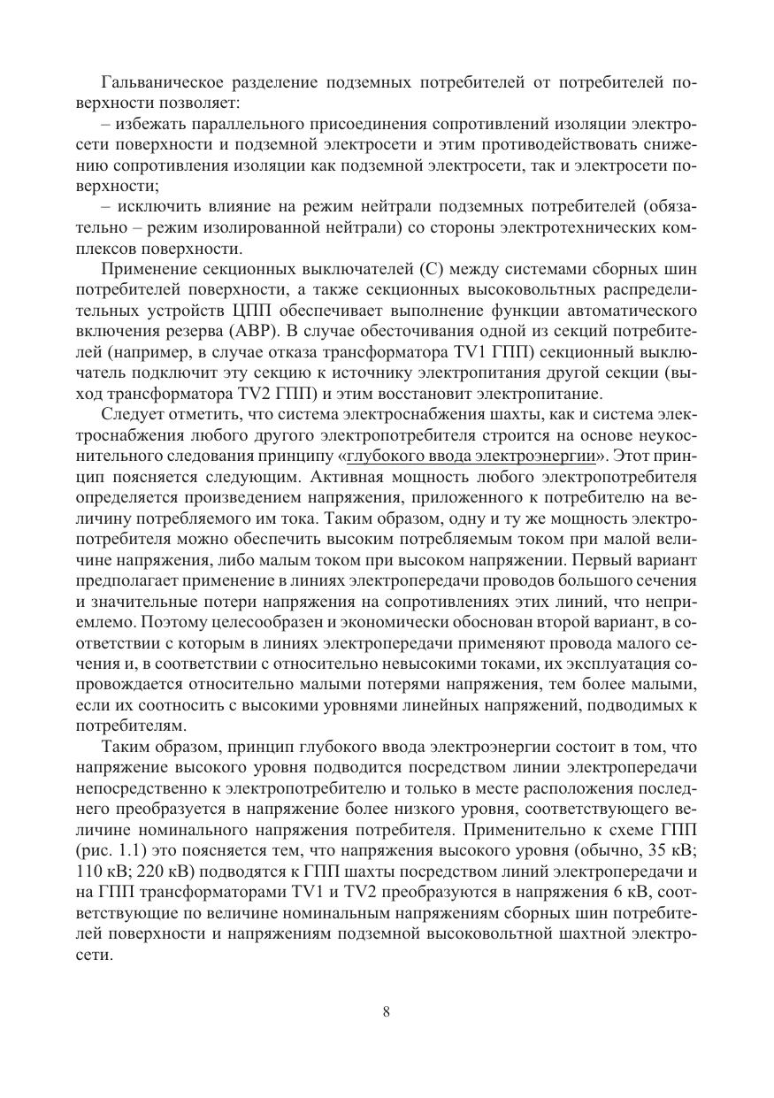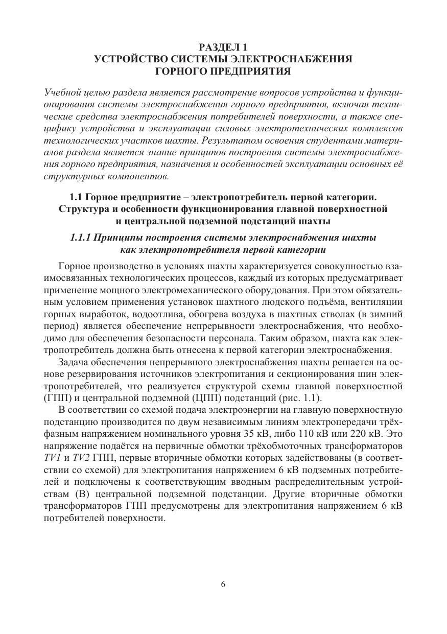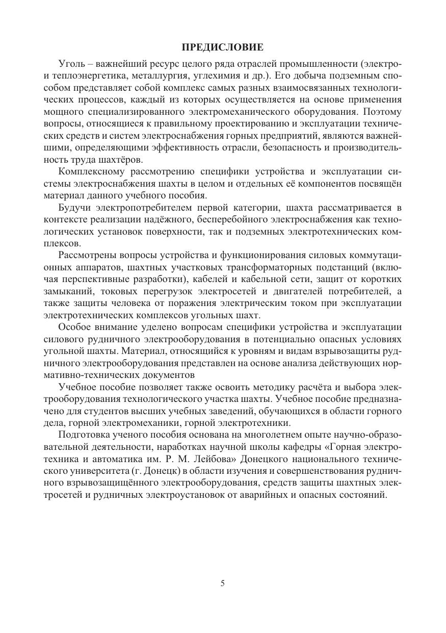 Изложены основные принципы устройства и функционирования системы электроснабжения горного предприятия, включая технические средства электроснабжения потребителей поверхности, а также специфику устройства и эксплуатации силовых электротехнических комплексов технологических участков шахты. Рассмотрены особенности устройства и функциональных свойств средств обеспечения безаварийной эксплуатации рудничного электрооборудования, а также организационные меры по созданию безопасных условий эксплуатации электрооборудования в условиях шахт. Приведена методика расчета и выбора электрооборудования системы электроснабжения технологического участка шахты.