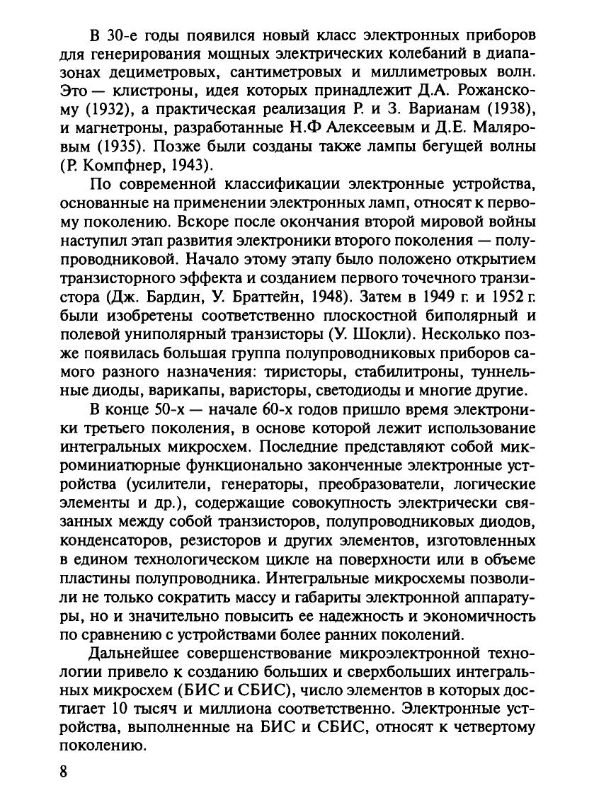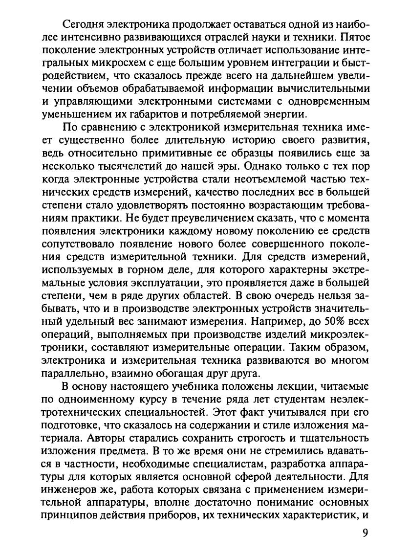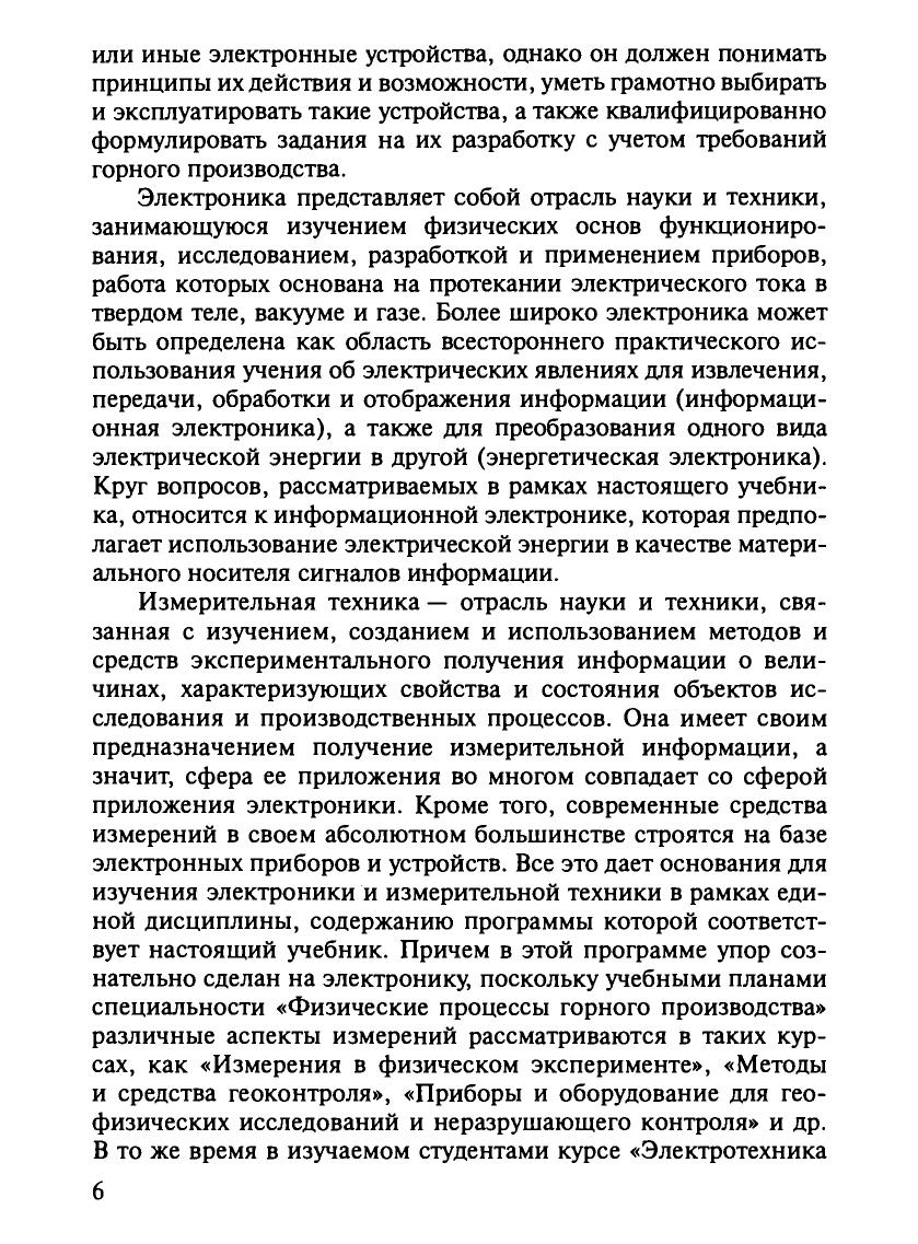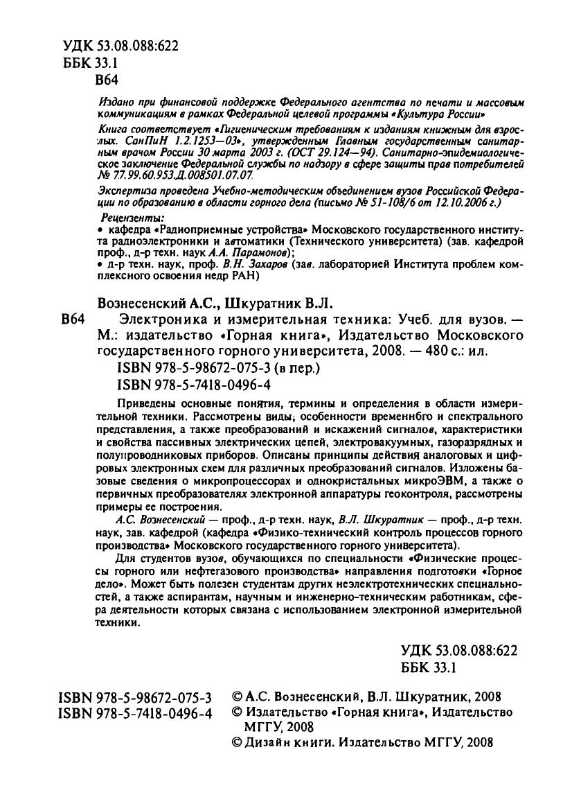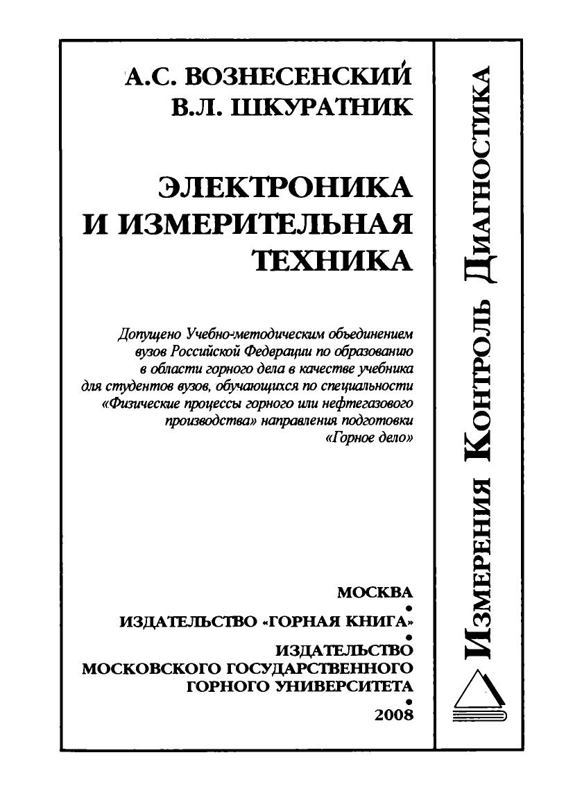 Приведены основные понятия, термины и определения в области измерительной техники. Рассмотрены виды особенности временного и спектрального представления, а также преобразований и искажений сигналов, характеристики и свойства пассивных электрических цепей, электровакуумных, газоразрядных и полупроводниковых приборов. Описаны принципы действия аналоговых и цифровых электронных схем для различных преобразований сигналов. Изложены базовые сведения о микропроцессорах и однокристальных микроЭВМ, а также о первичных преобразователях электронной аппаратуры геоконтроля, рассмотрены примеры ее построения. А.С. Вознесенский — проф., д-р техн. наук, ВЛ. Шкуратник — проф., д-р техн. наук, зав. кафедрой (кафедра «Физико-технический контроль процессов горного производства» Московского государственного горного университета). Для студентов вузов, обучающихся по специальности «Физические процессы горного или нефтегазового производства» направления подготовки «Горное дело». Может быть полезен студентам других неэлектротехнических специальностей, а также аспирантам, научным и инженерно-техническим работникам, сфера деятельности которых связана с использованием электронной измерительной техники.