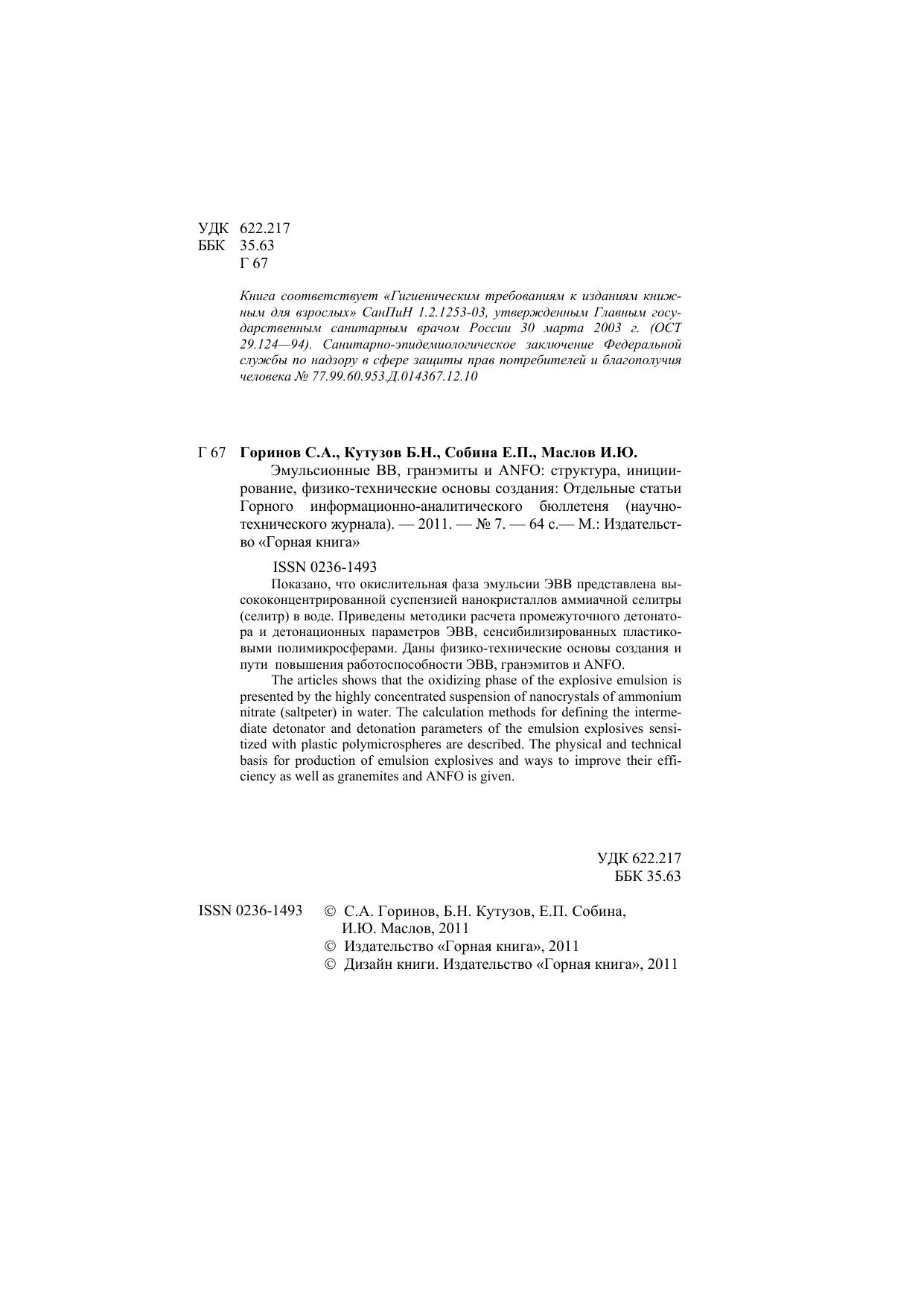 Показано, что окислительная фаза эмульсии ЭВВ представлена высококонцентрированной суспензией нанокристаллов аммиачной селитры (селитр) в воде. Приведены методики расчета промежуточного детонатора и детонационных параметров ЭВВ, сенсибилизированных пластиковыми полимикросферами. Даны физико-технические основы создания и пути повышения работоспособности ЭВВ, гранэмитов и ANFO.