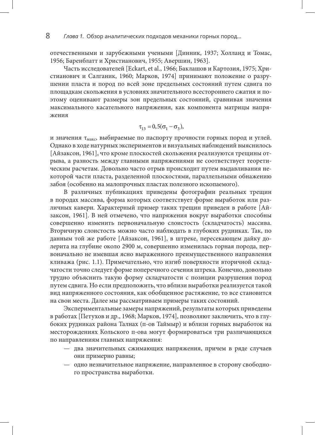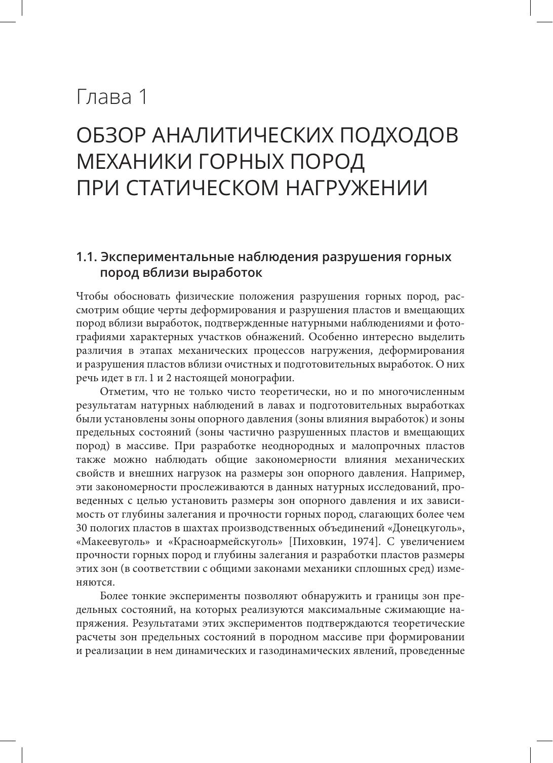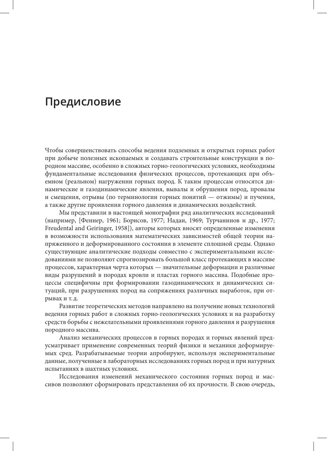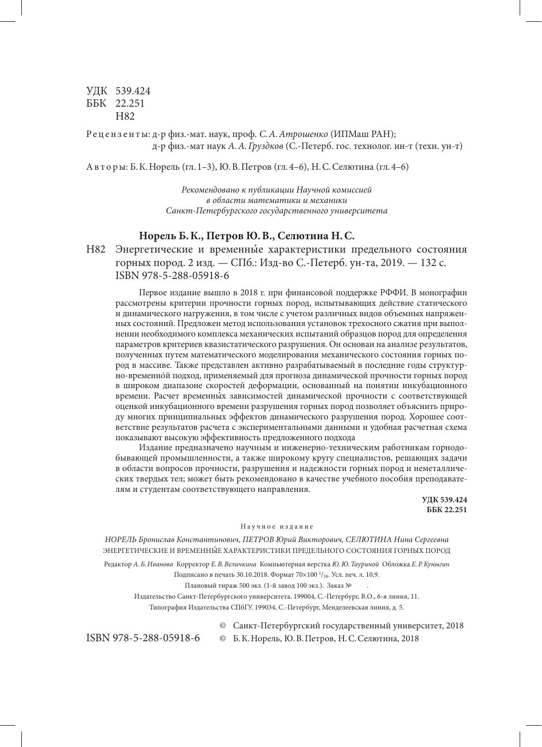 Первое издание вышло в 2018 г. при финансовой поддержке РФФИ. В монографии рассмотрены критерии прочности горных пород, испытывающих действие статического и динамического нагружения, в том числе с учетом различных видов объемных напряженных состояний. Предложен метод использования установок трехосного сжатия при выполнении необходимого комплекса механически испытаний образцов пород для определения параметров критериев квазистатического разрушения. Он основан на анализе результатов, полученных путем математического моделирования механического состояния горных пород в массиве. Также представлен активно разрабатываемый в последние годы структурно-временнóй подход, применяемый для прогноза динамической прочности горных пород в широком диапазоне скоростей деформации, основанный на понятии инкубационного времени. Расчет временных́ зависимостей динамической прочности с соответствующей оценкой инкубационного времени разрушения горных пород позволяет объяснить природу многих принципиальных эффектов динамического разрушения пород. Хорошее соответствие результатов расчета с экспериментальными данными и удобная расчетная схема показывают высокую эффективность предложенного подхода Издание предназначено научным и инженерно-техническим работникам горнодобывающей промышленности, а также широкому кругу специалистов, решающих задачи в области вопросов прочности, разрушения и надежности горных пород и неметаллических твердых тел; может быть рекомендовано в качестве учебного пособия преподавателям и студентам соответствующего направления.