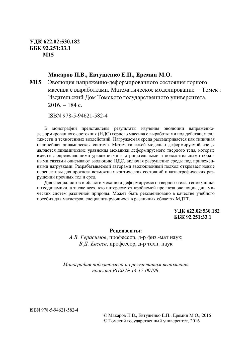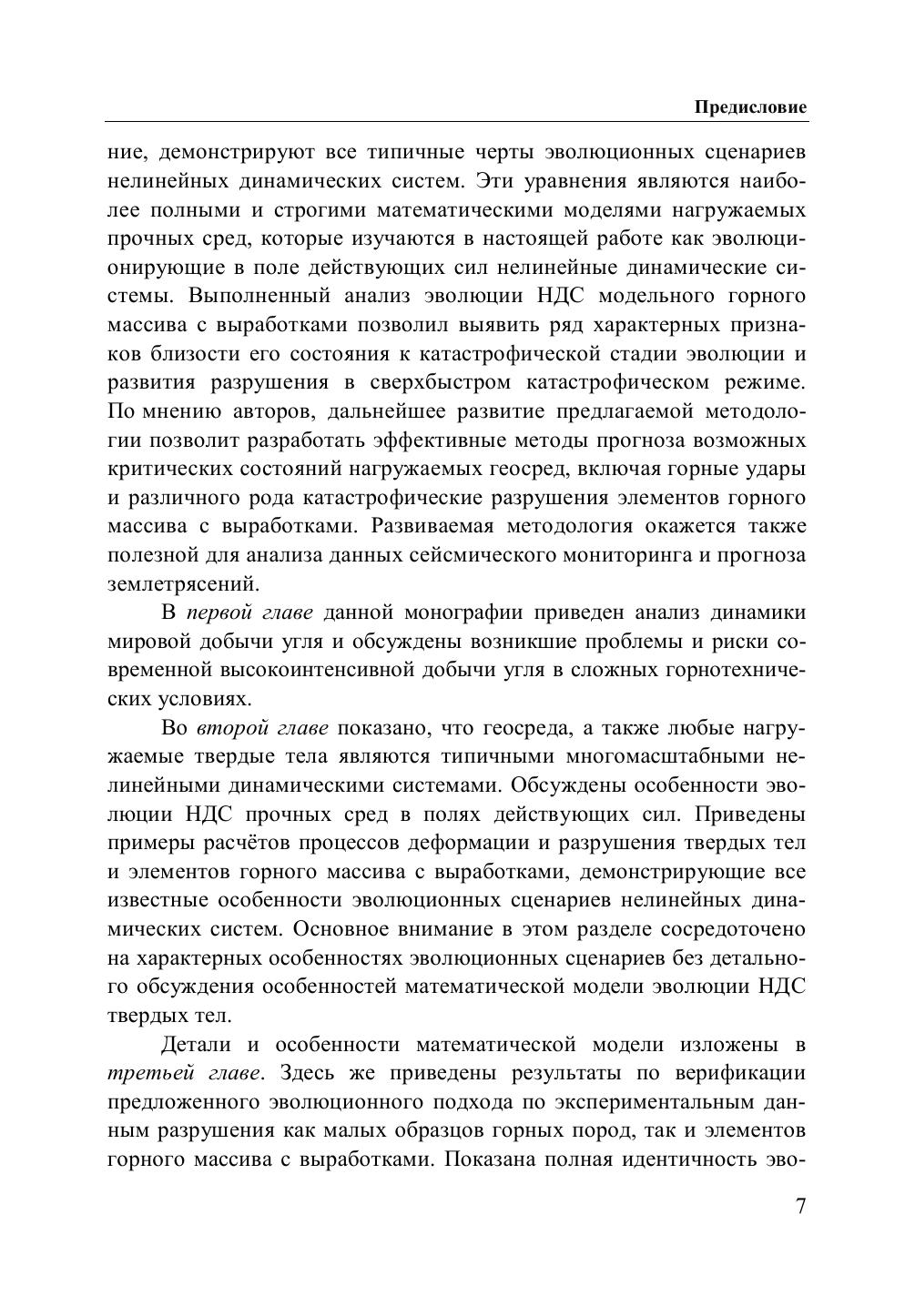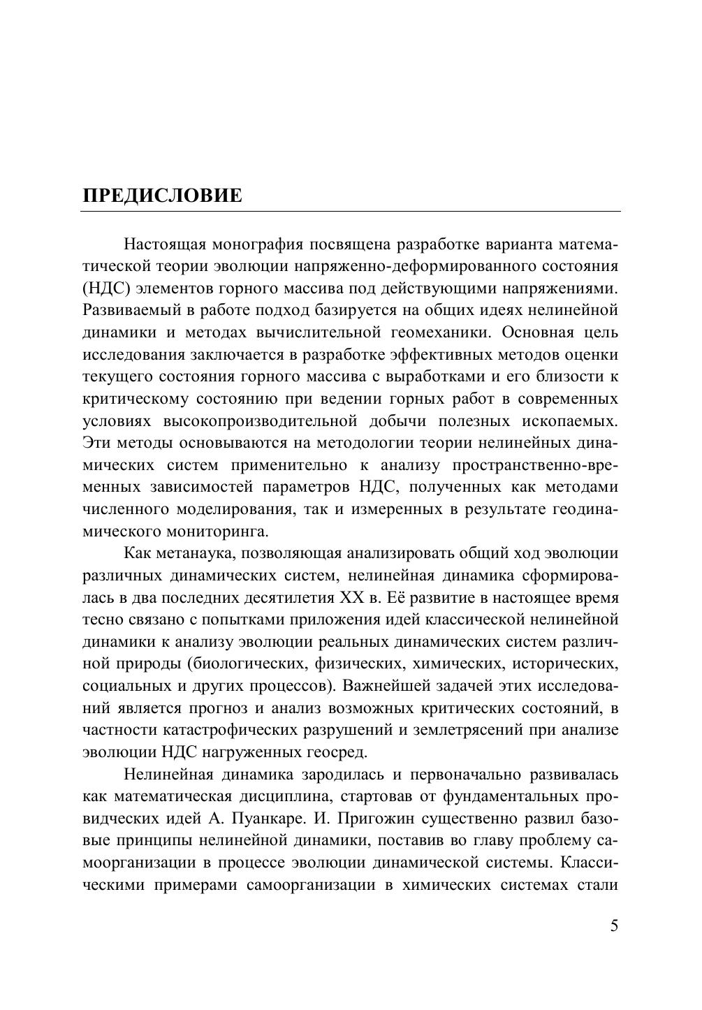 В монографии представлены результаты изучения эволюции напряженно-деформированного состояния (НДС) горного массива с выработками под действием сил тяжести и техногенных воздействий. Нагружаемая среда рассматривается как типичная нелинейная динамическая система. Математической моделью деформируемой среды являются динамические уравнения механики деформируемого твердого тела, которые вместе с определяющими уравнениями и отрицательными и положительными обратными связями описывают эволюцию НДС, включая разрушение среды под приложенными нагрузками. Разрабатываемый авторами эволюционный подход открывает новые перспективы для прогноза возможных критических состояний и катастрофических разрушений прочных тел и сред. Для специалистов в области механики деформируемого твердого тела, геомеханики и геодинамики, а также всех, кто интересуется проблемой прогноза эволюции динамических систем различной природы. Может быть рекомендовано в качестве учебного пособия для магистров, специализирующихся в различных областях МДТТ.