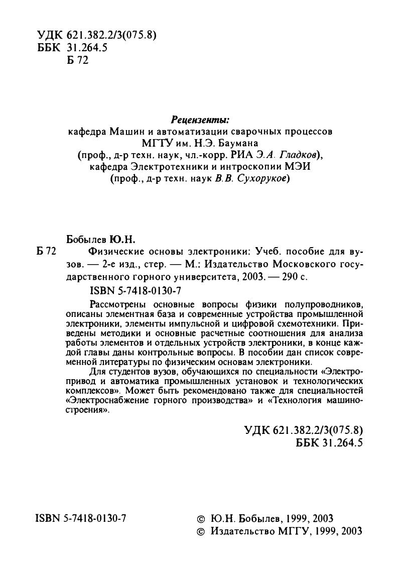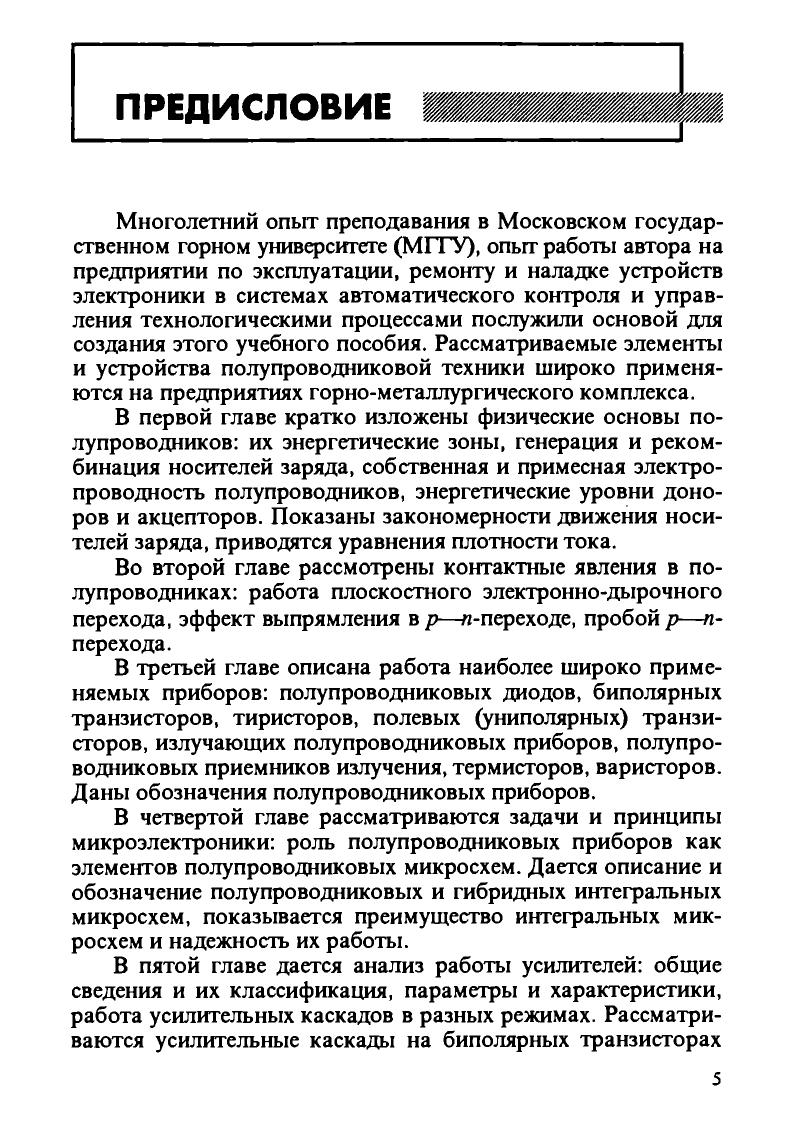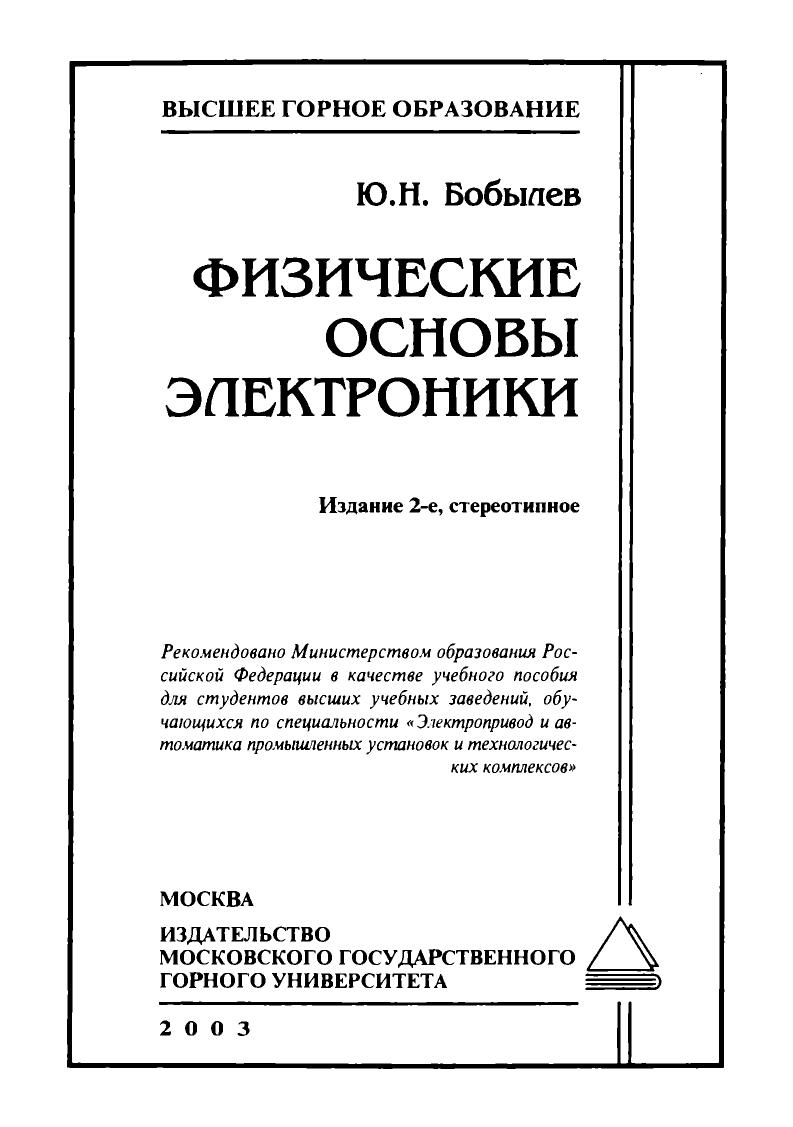 Рассмотрены основные вопросы физики полупроводников, описаны элементная база и современные устройства промышленной электроники, элементы импульсной и цифровой схемотехники. Приведены методики и основные расчетные соотношения для анализа работы элементов и отдельных устройств электроники, в конце каждой главы даны контрольные вопросы. В пособии дан список современной литературы по физическим основам электроники. Для студентов вузов, обучающихся по специальности «Электропривод и автоматика промышленных установок и технологических комплексов». Может быть рекомендовано также для специальностей «Электроснабжение горного производства» и «Технология машиностроения».