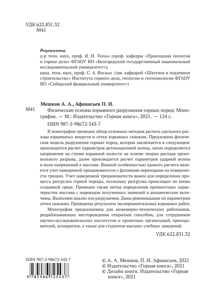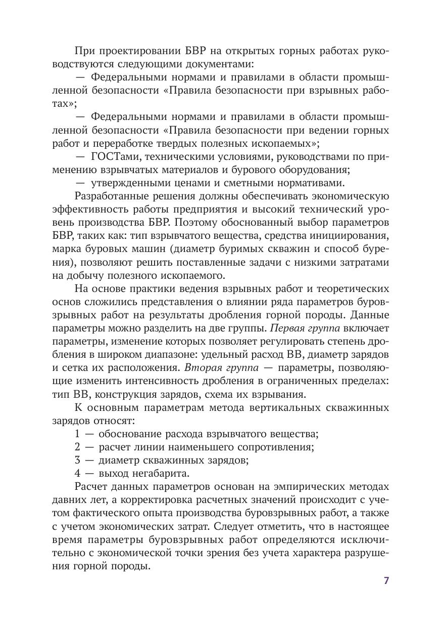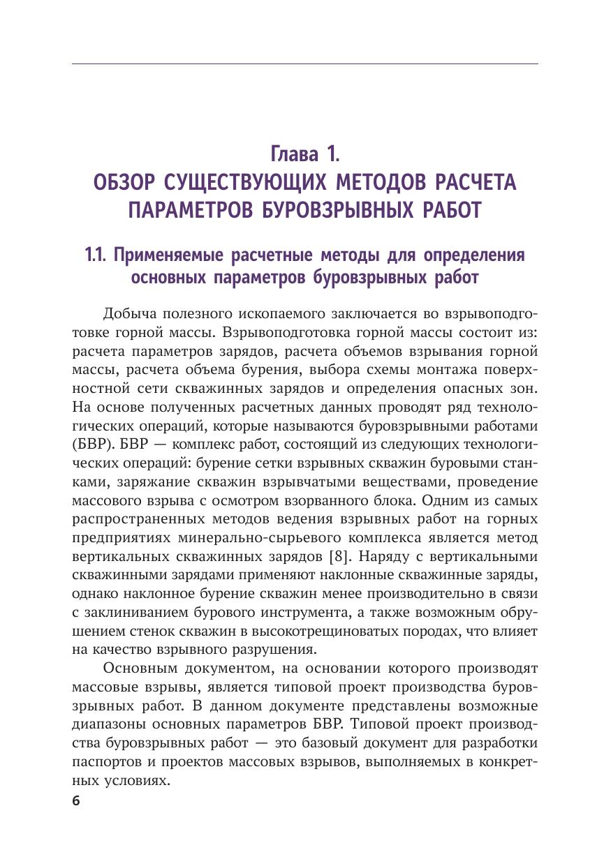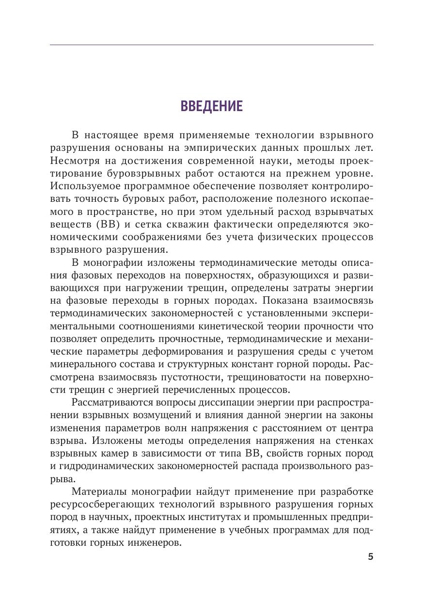 В монографии проведен обзор основных методов расчета удельного расхода взрывчатых веществ и сетки взрывных скважин. Предложена физическая модель разрушения горных пород, которая заключается в следующем: производится расчет параметров детонационной волны, затем определяется напряжение на стенке взрывной полости на основе теории распада произвольного разрыва, далее производится расчет параметров ударной волны и волн напряжений в массиве. Важной особенностью данного расчета является учет наведенной трещиноватости с фазовыми переходами на поверхности трещин. Учет наведенной трещиноватости важен для определения процесса разгрузки горной породы, поскольку разгрузка происходит по вновь созданной среде. Приведен также метод определения прочностных характеристик массива с переводом полученных значений в динамические величины. Выполнен анализ зон разрушения. Даны рекомендации по параметрам сетки скважин. Приведены результаты экспериментальных взрывных работ. Монография предназначена для инженерно-технических работников, разрабатывающих месторождения открытым способом, для сотрудников научно-исследовательских институтов и проектных организаций, преподавателей, аспирантов, а также для студентов высших учебных заведений.