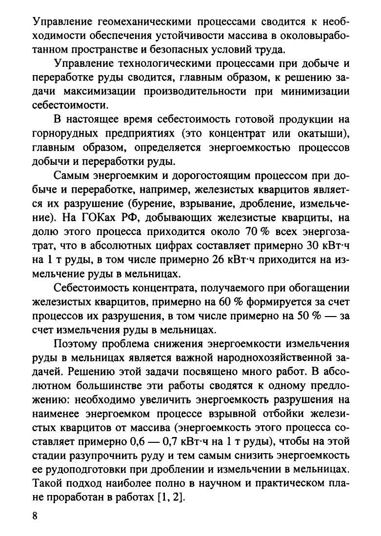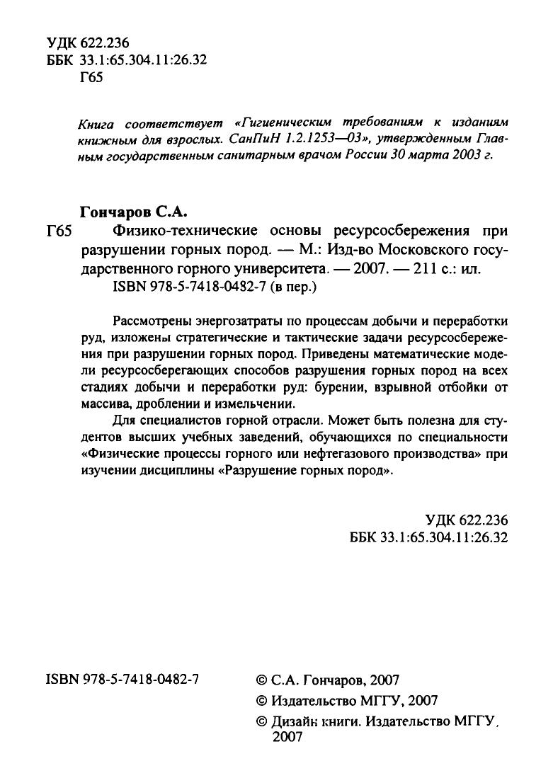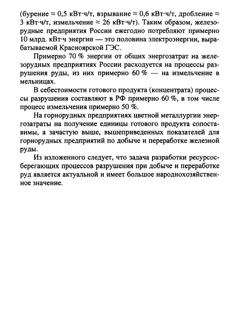 Рассмотрены энергозатраты по процессам добычи и переработки руд, изложены стратегические и тактические задачи ресурсосбережения при разрушении горных пород. Приведены математические модели ресурсосберегающих способов разрушения горных пород на всех стадиях добычи и переработки руд: бурении, взрывной отбойки от массива, дроблении и измельчении. Для специалистов горной отрасли. Может быть полезна для студентов высших учебных заведений, обучающихся по специальности «Физические процессы горного или нефтегазового производства» при изучении дисциплины «Разрушение горных пород».