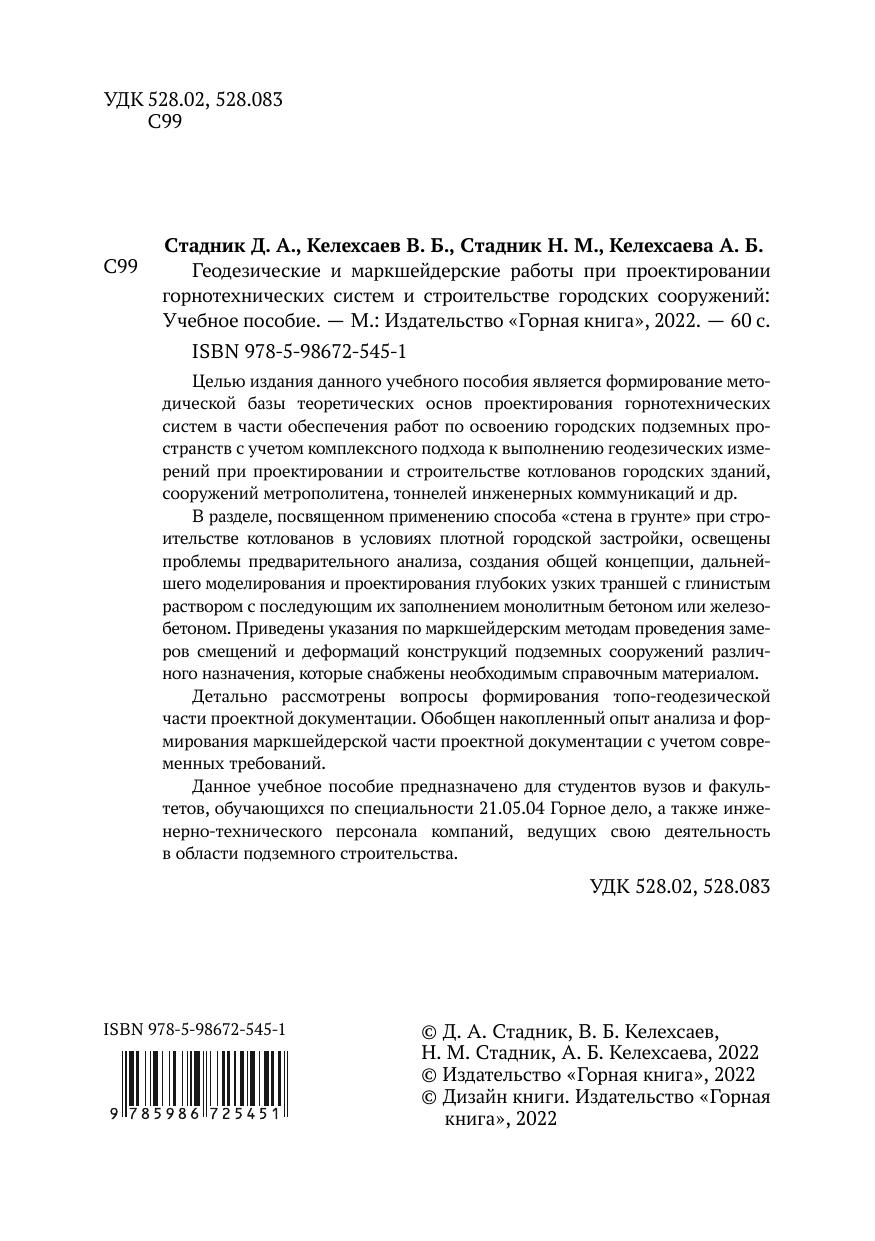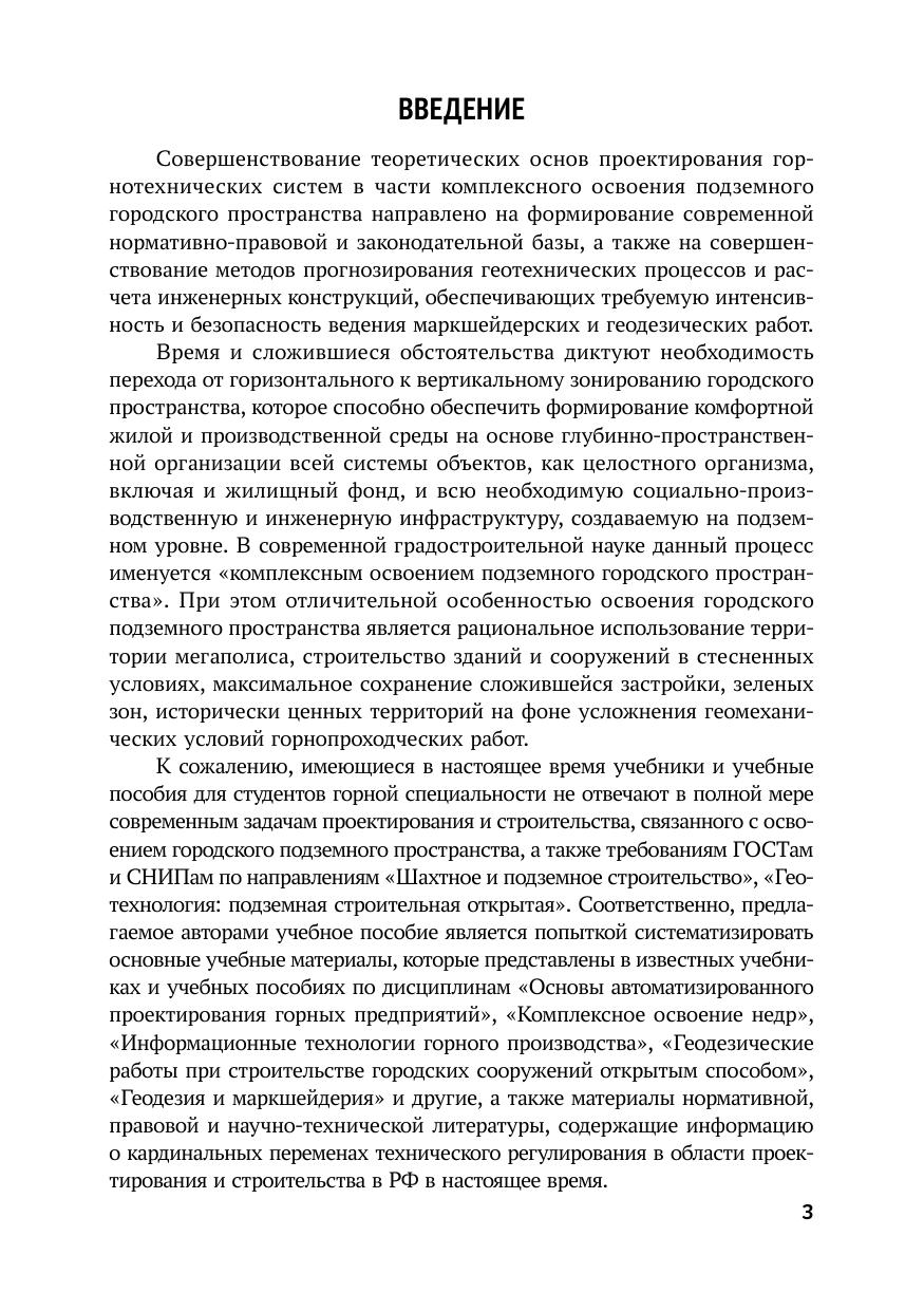 Целью издания данного учебного пособия является формирование методической базы теоретических основ проектирования горнотехнических систем в части обеспечения работ по освоению городских подземных пространств с учетом комплексного подхода к выполнению геодезических измерений при проектировании и строительстве котлованов городских зданий, сооружений метрополитена, тоннелей инженерных коммуникаций и др. В разделе, посвященном применению способа «стена в грунте» при строительстве котлованов в условиях плотной городской застройки, освещены проблемы предварительного анализа, создания общей концепции, дальнейшего моделирования и проектирования глубоких узких траншей с глинистым раствором с последующим их заполнением монолитным бетоном или железобетоном. Приведены указания по маркшейдерским методам проведения замеров смещений и деформаций конструкций подземных сооружений различного назначения, которые снабжены необходимым справочным материалом. Детально рассмотрены вопросы формирования топо-геодезической части проектной документации. Обобщен накопленный опыт анализа и формирования маркшейдерской части проектной документации с учетом современных требований. Данное учебное пособие предназначено для студентов вузов и факультетов, обучающихся по специальности 21.05.04 Горное дело, а также инженерно-технического персонала компаний, ведущих свою деятельность в области подземного строительства.