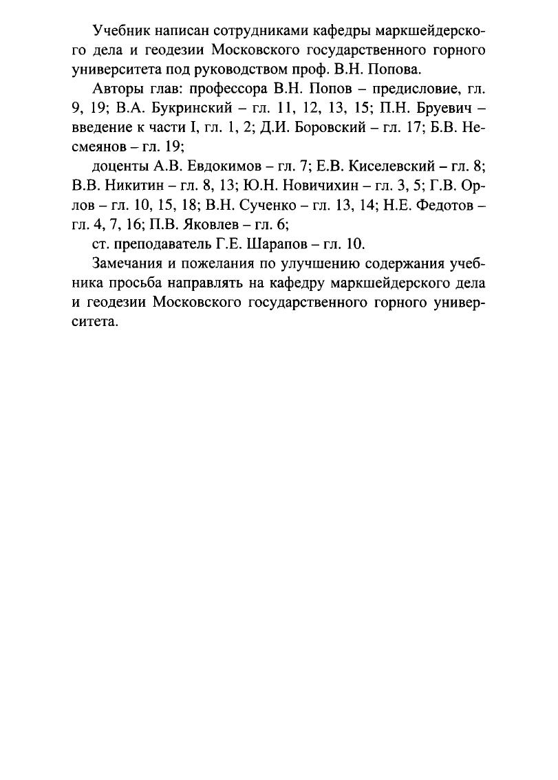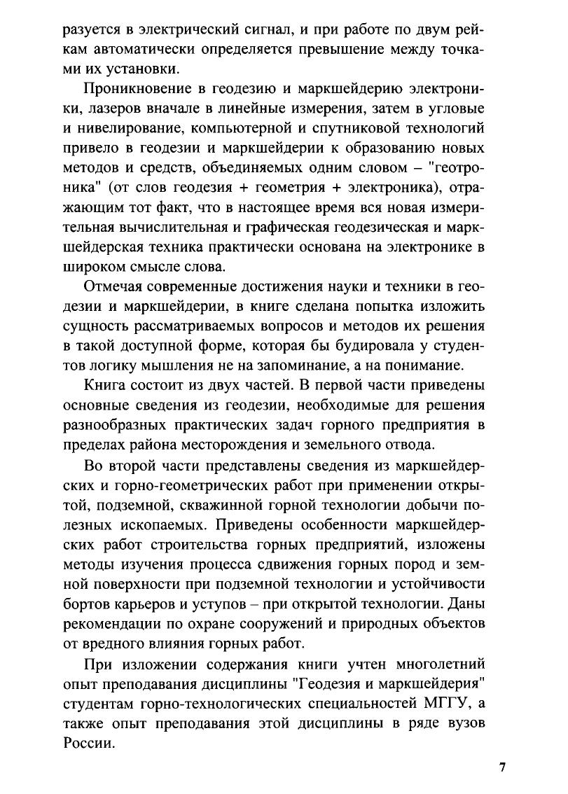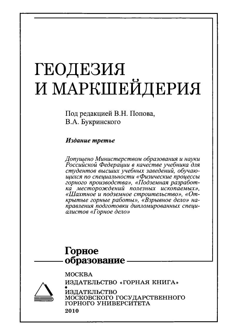Изложены теоретические основы геодезии и маркшейдерии, обобщен опыт производства работ при проектировании, строительстве и эксплуатации горно-рудных предприятий, наземных и подземных сооружений различного назначения. Рассмотрены особенности создания геодезических и маркшейдерских сетей, методы геодезических и маркшейдерских съемок с описанием приборов для измерения угловых и линейных величин на местности и в выработках. Приведены методы геометризации и подсчета запасов месторождений полезных ископаемых, сведения о сдвижении горных пород и земной поверхности под влиянием горных выработок и охране сооружений от их вредного воздействия, об устойчивости бортов карьеров и отвалов. Для студентов высших учебных заведений.
