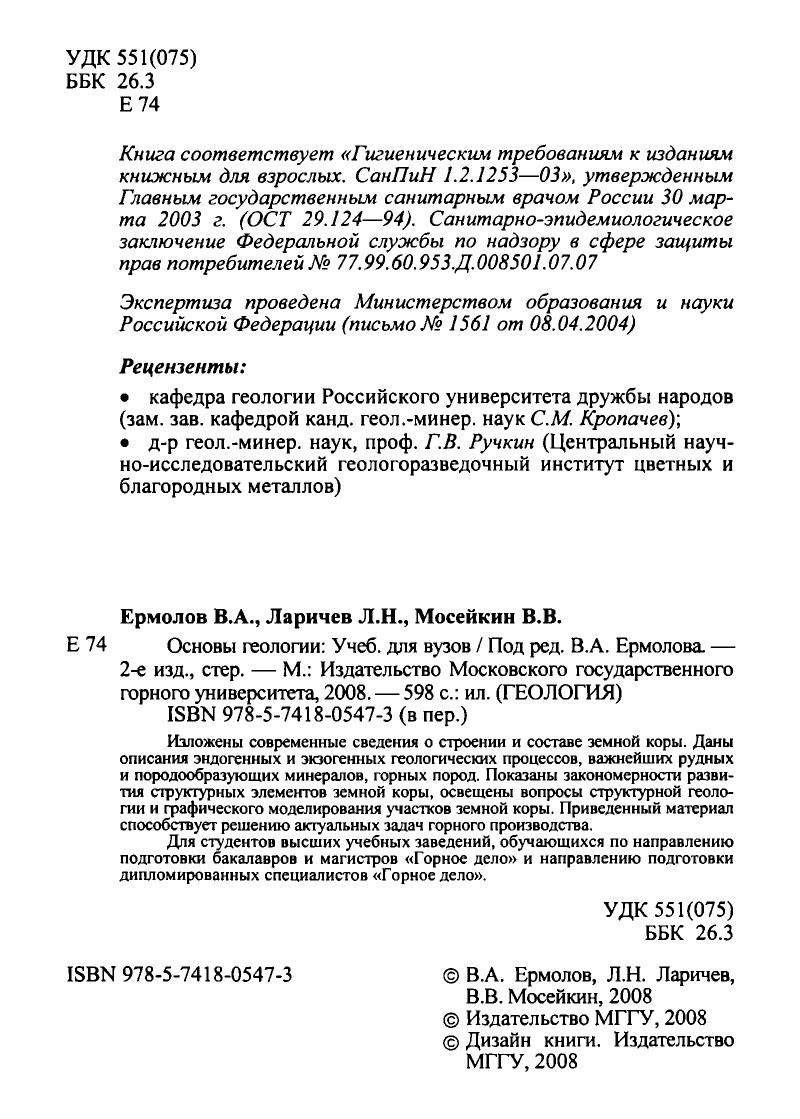Гриф: Допущено Министерством образования и науки РФ в качестве учебника для студентов высших учебных заведений, обучающихся по направлению подготовки бакалавров и магистров «Горное дело» и направлению подготовки дипломированных специалистов «Горное дело»