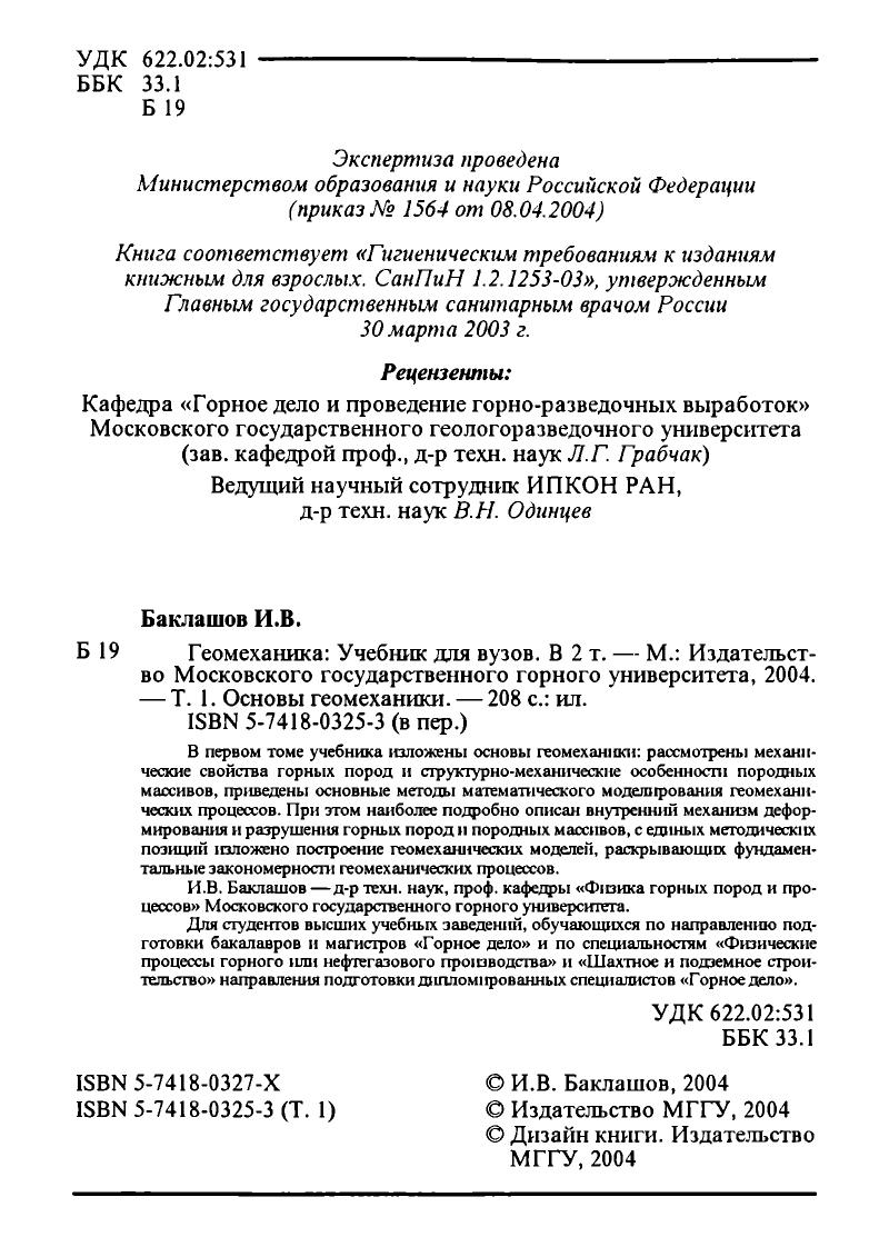 Гриф: Допущено Министерством образования и науки Российской Федерации в качестве учебника для студентов высших учебных заведений, обучающихся по направлению подготовки бакалавров и магистров «Горное дело» и по специальностям «Физические процессы горного или нефтегазового производства» и «Шахтное и подземное строительство» направления подготовки дипломированных специалистов «Горное дело»