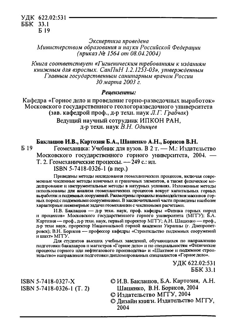 Гриф: Допущено Министерством образования и науки Российской Федерации в качестве учебника для студентов высших учебных заведений, обучающихся по направлению подготовки бакалавров и магистров «Горное дело» и по специальностям «Физические процессы горного или нефтегазового производства» и «Шахтное и подземное строительство» направления подготовки дипломированных специалистов «Горное дело»