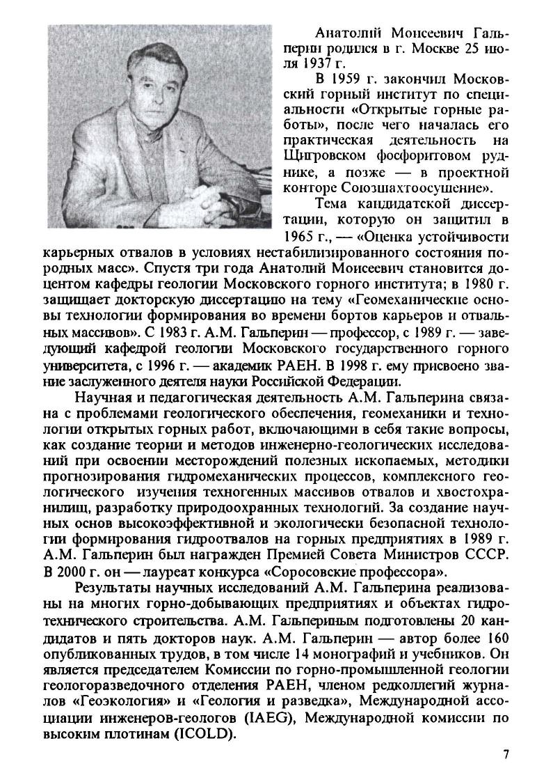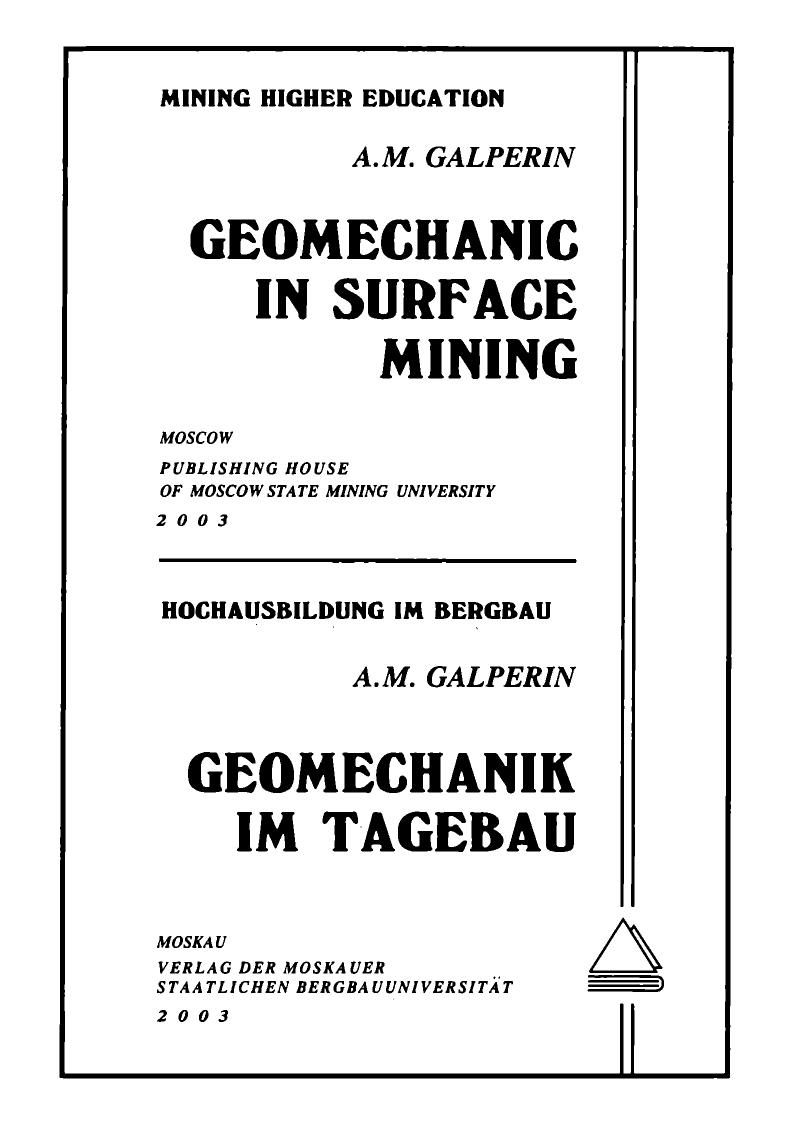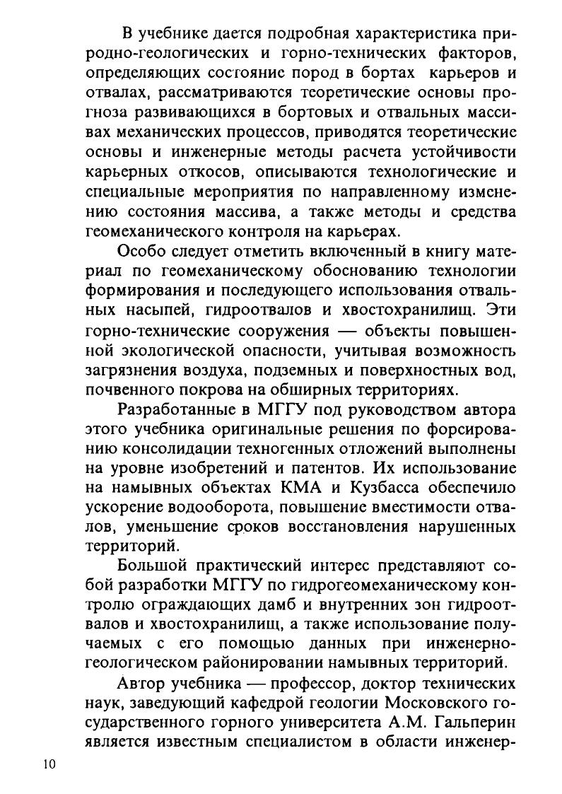 Рассмотрены природно-геологические и технологические факторы, определяющие состояние бортовых и отвальных массивов. Приведен анализ процессов нарушения устойчивости бортов карьеров, отвальных насыпей, дамб гидроотвалов и хвостохранилищ. Изложены теоретические основы прогноза геомеханическпх процессов в бортовых и отвальных массивах, инженерные методы расчета устойчивости карьерных откосов, описаны технологические и специальные мероприятия по направленному изменению состояния массива. Освещены вопросы геомеханического обоснования технологии формирования и рекультивации отвальных насыпей и намывных горно-технических сооружений с учетом требовании обеспечения промышленной и экологической безопасности. Дана характеристика методов и средств геомеханического контроля на карьерах. Для студентов, обучающихся по направлению подготовки дипломированных специалистов «Горное дело».