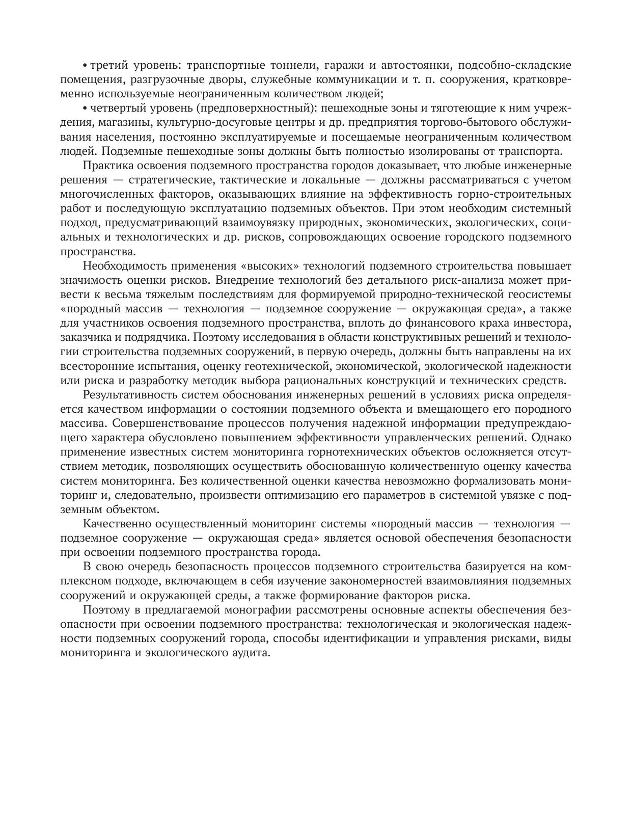 В монографии рассмотрены основные аспекты обеспечения геотехнологической и экологической безопасности при освоении подземного пространства городов: технологическая и экологическая надежности подземных сооружений города, способы идентификации и управления рисками, виды мониторинга и экологического аудита. Книга рассчитана на широкий круг читателей: проектировщиков, производственников, предпринимателей, работников научных и учебных учреждений, аспирантов, магистров и студентов высших учебных заведений, обучающихся по специальности «Шахтное и подземное строительство».