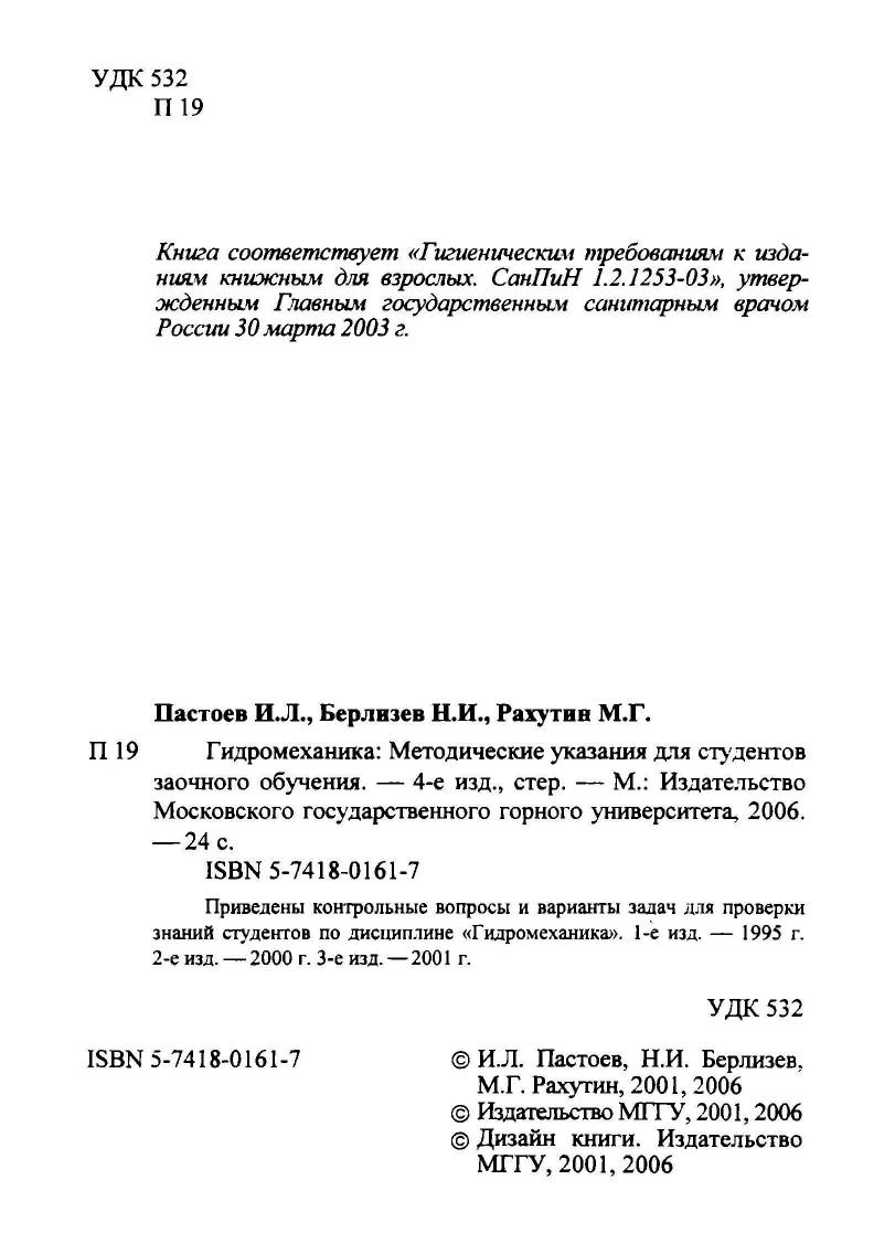 Приведены контрольные вопросы и варианты задач для проверки знаний студентов по дисциплине "Гидромеханика".