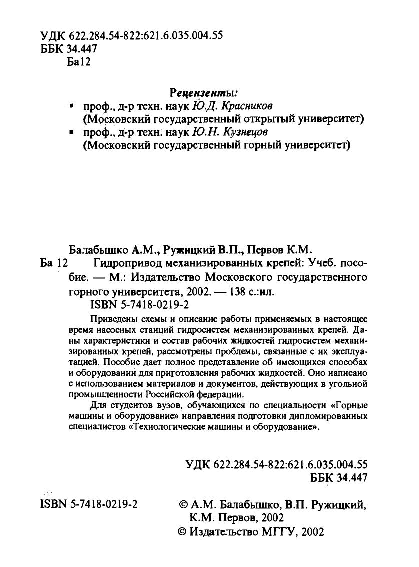 Гриф: Допущено Учебно-методическим объединением вузов Российской Федерации по образованию в области горного дела в качестве учебного пособия для студентов вузов, обучающихся по специальности «Горные машины и оборудование» направления подготовки дипломированных специалистов «Технологические машины и оборудование».