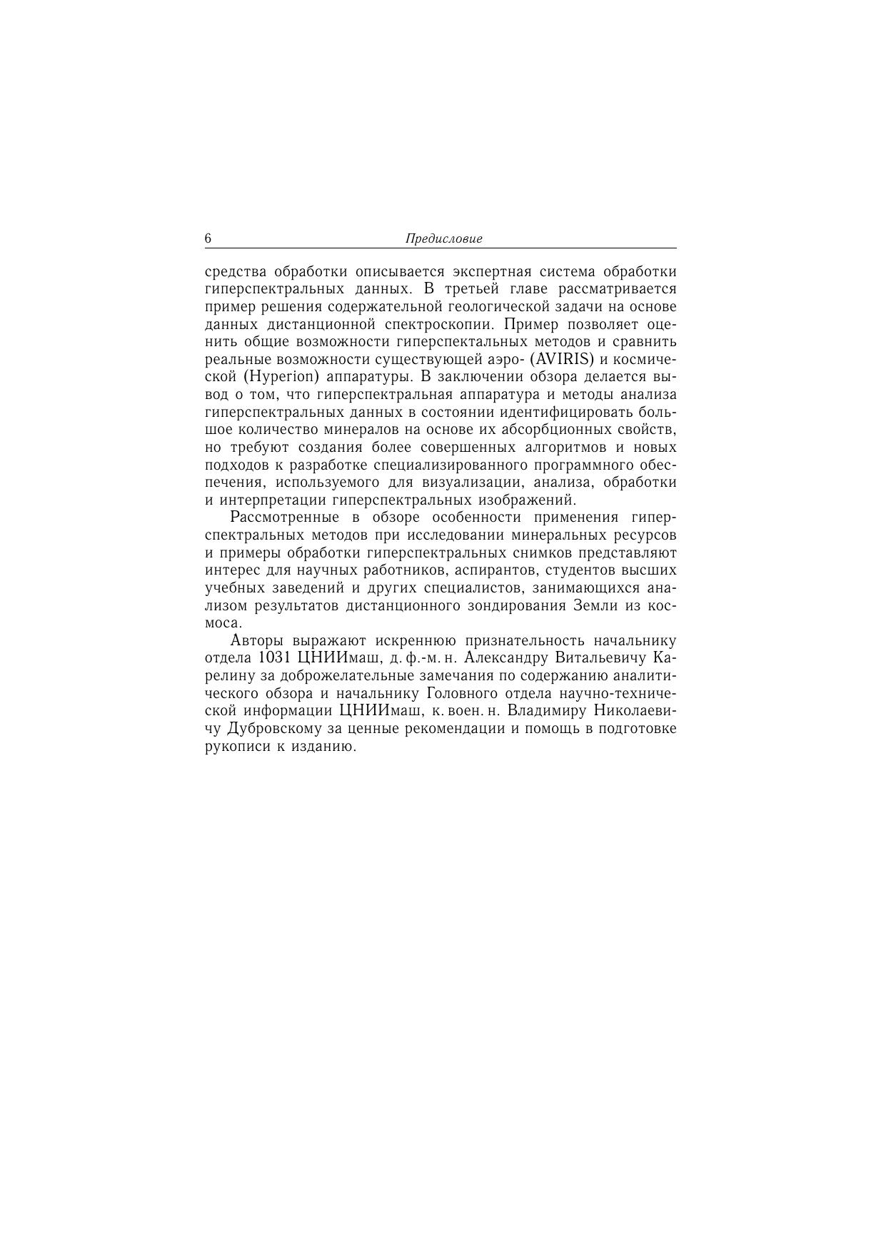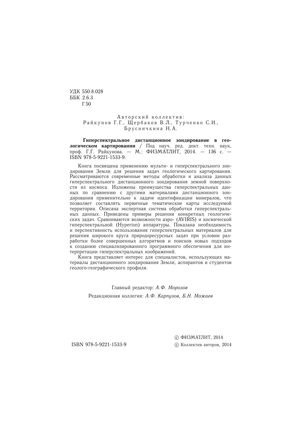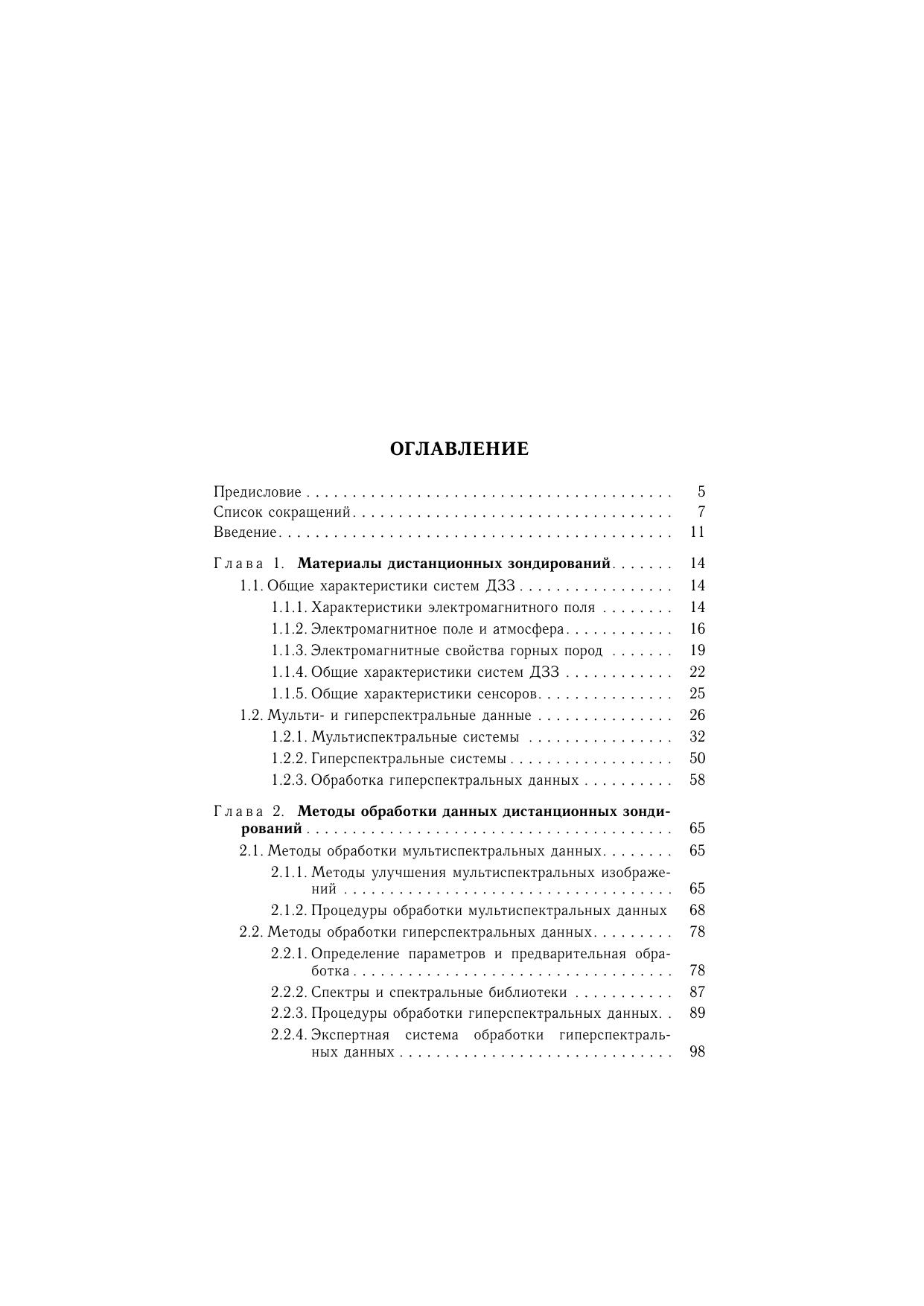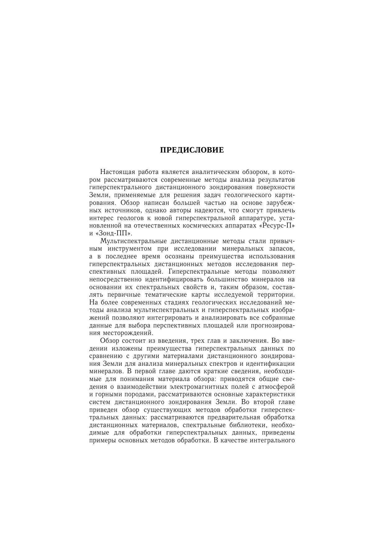 Книга посвящена применению мульти- и гиперспектрального зондирования Земли для решения задач геологического картирования. Рассматриваются современные методы обработки и анализа данных гиперспектрального дистанционного зондирования земной поверхности из космоса. Изложены преимущества гиперспектральных данных по сравнению с другими материалами дистанционного зондирования применительно к задаче идентификации минералов, что позволяет составлять первичные тематические карты исследуемой территории. Описана экспертная система обработки гиперспектральных данных. Приведены примеры решения конкретных геологических задач. Сравниваются возможности аэро- (AVIRIS) и космическойгиперспектральной (Hyperion) аппаратуры. Показана необходимость и перспективность использования гиперспектральных материалов для решения широкого круга природоресурсных задач при условии разработки более совершенных алгоритмов и поисков новых подходов к созданию специализированного программного обеспечения для интерпретации гиперспектральных изображений. Книга представляет интерес для специалистов, использующих материалы дистанционного зондирования Земли, аспирантов и студентов геолого-географического профиля.