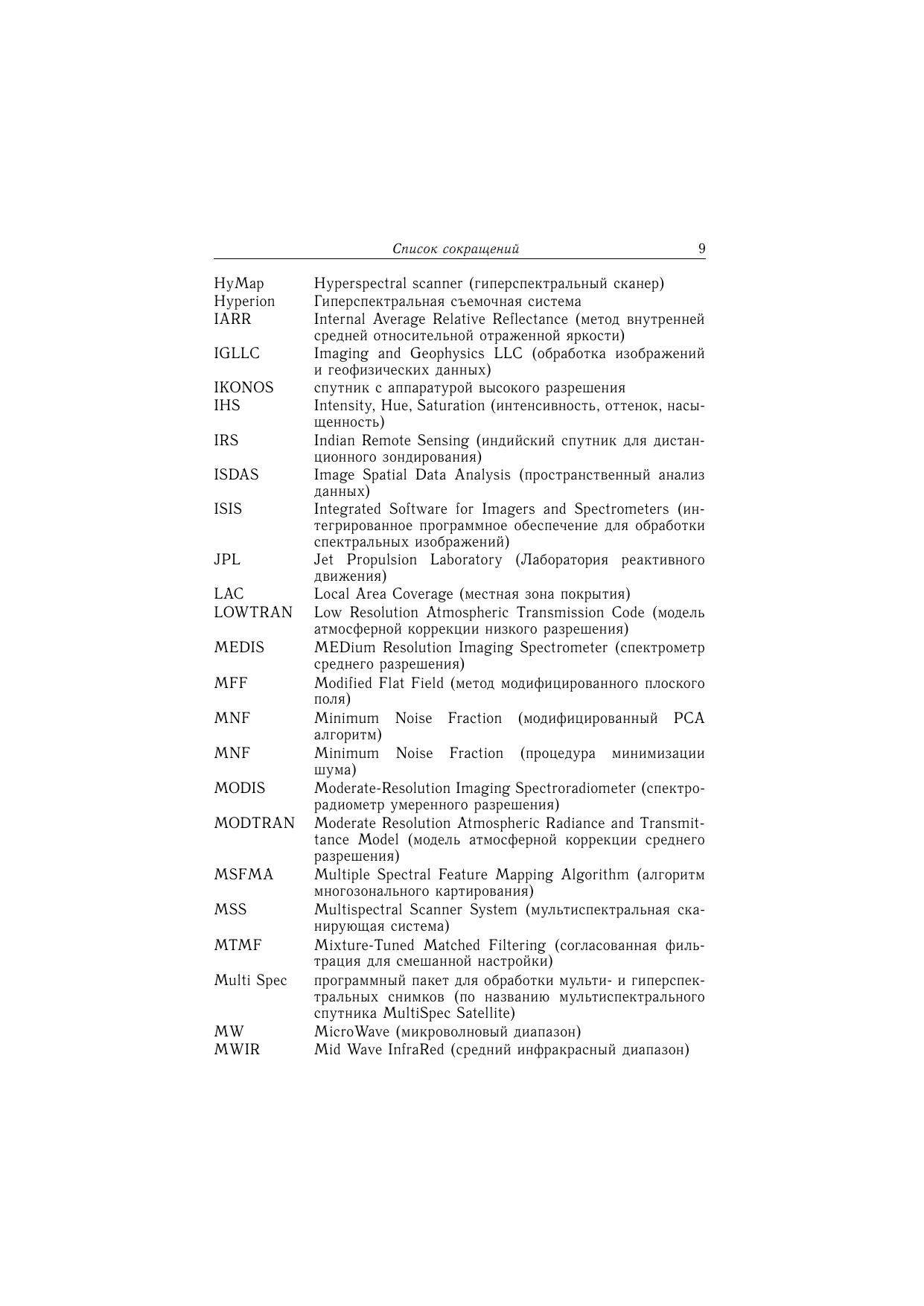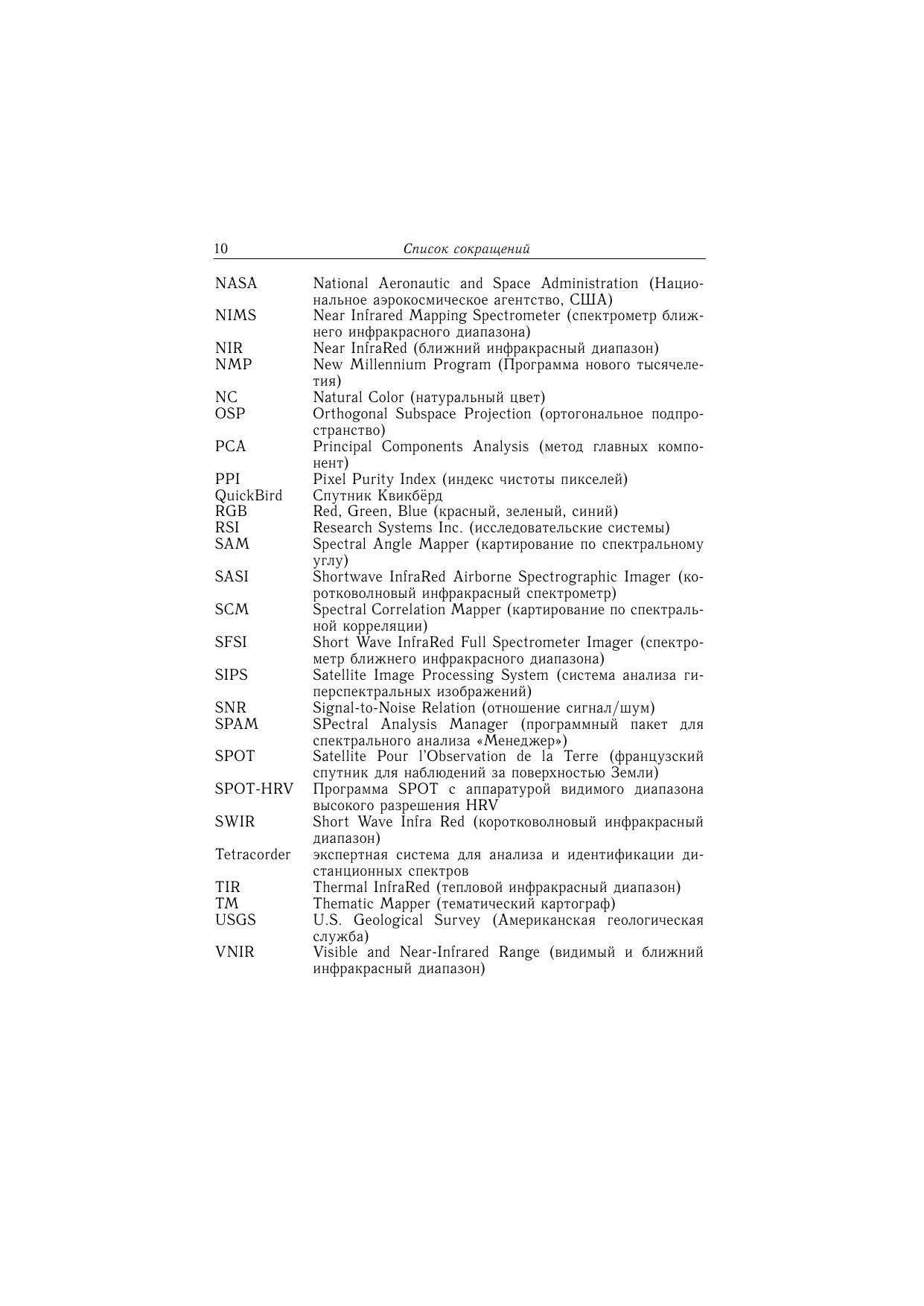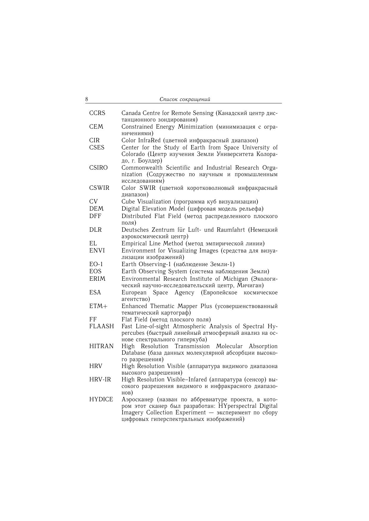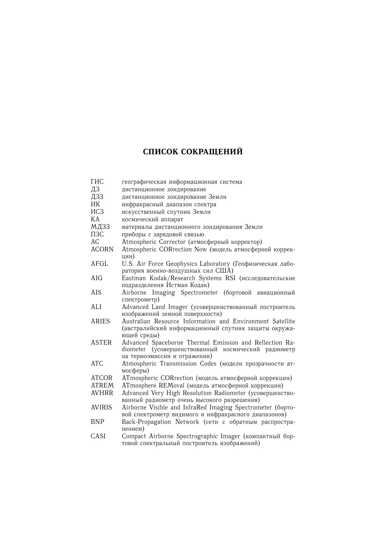 Книга посвящена применению мульти- и гиперспектрального зондирования Земли для решения задач геологического картирования. Рассматриваются современные методы обработки и анализа данных гиперспектрального дистанционного зондирования земной поверхности из космоса. Изложены преимущества гиперспектральных данных по сравнению с другими материалами дистанционного зондирования применительно к задаче идентификации минералов, что позволяет составлять первичные тематические карты исследуемой территории. Описана экспертная система обработки гиперспектральных данных. Приведены примеры решения конкретных геологических задач. Сравниваются возможности аэро- (AVIRIS) и космическойгиперспектральной (Hyperion) аппаратуры. Показана необходимость и перспективность использования гиперспектральных материалов для решения широкого круга природоресурсных задач при условии разработки более совершенных алгоритмов и поисков новых подходов к созданию специализированного программного обеспечения для интерпретации гиперспектральных изображений. Книга представляет интерес для специалистов, использующих материалы дистанционного зондирования Земли, аспирантов и студентов геолого-географического профиля.