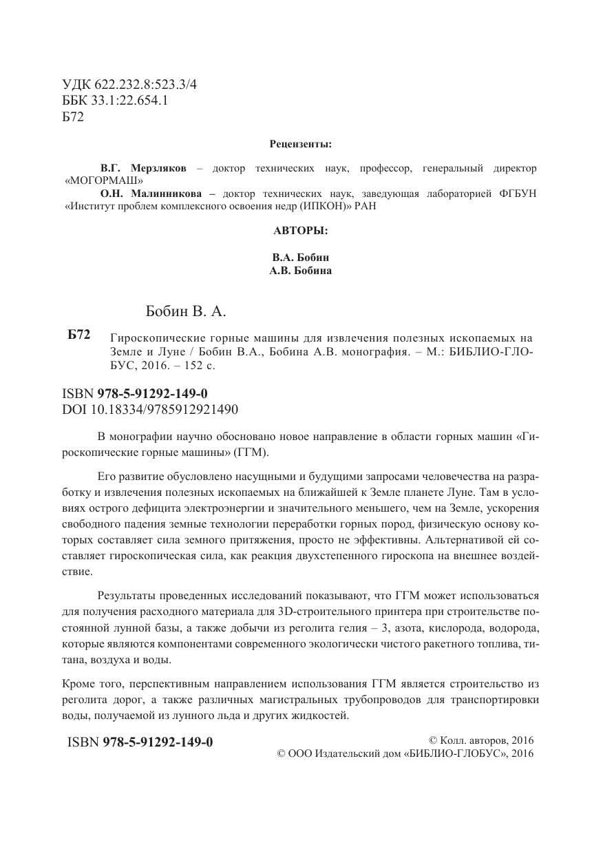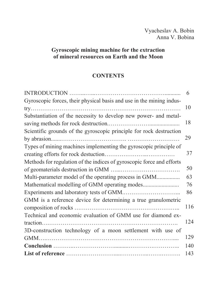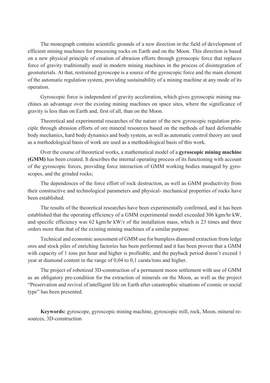 В монографии научно обосновано новое направление в области горных машин «Гироскопические горные машины» (ГГМ). Его развитие обусловлено насущными и будущими запросами человечества на разработку и извлечения полезных ископаемых на ближайшей к Земле планете Луне. Там в условиях острого дефицита электроэнергии и значительного меньшего, чем на Земле, ускорения свободного падения земные технологии переработки горных пород, физическую основу которых составляет сила земного притяжения, просто не эффективны. Альтернативой ей составляет гироскопическая сила, как реакция двухстепенного гироскопа на внешнее воздействие. Результаты проведенных исследований показывают, что ГГМ может использоваться для получения расходного материала для 3D-строительного принтера при строительстве постоянной лунной базы, а также добычи из реголита гелия – 3, азота, кислорода, водорода, которые являются компонентами современного экологически чистого ракетного топлива, титана, воздуха и воды.