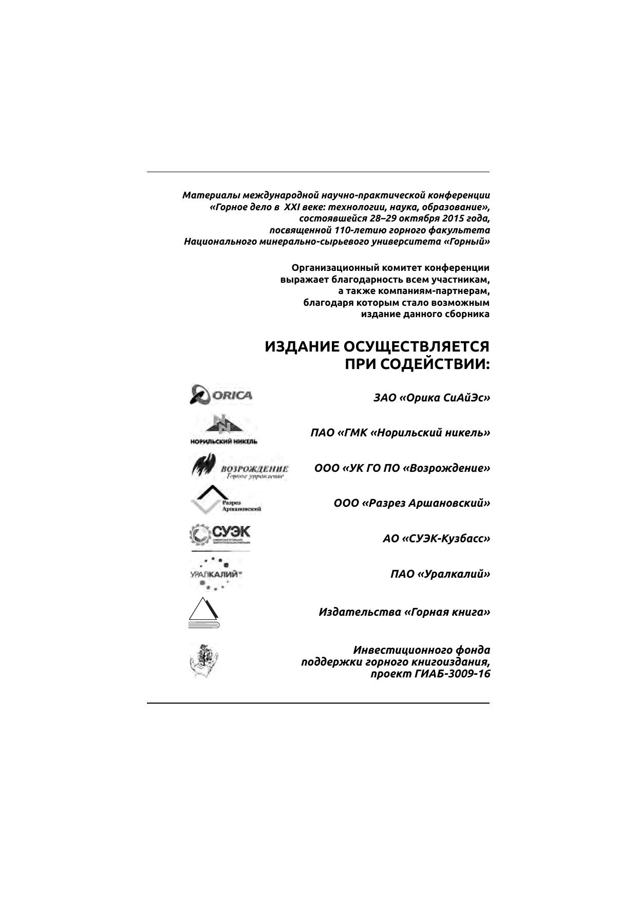 В сборник включены доклады участников Международной научно-практической конференции «Горное дело в XXI веке: технологии, наука, образование», состоявшейся 28–29 октября 2015 года и посвященной 110-летию горного факультета первого технического ВУЗа России – Национального минерально-сырьевого университета «Горный». Доклады были представлены на секциях: «Подземная разработка твердых полезных ископаемых»; «Открытые горные работы»; «Взрывное дело»; «Технологическая безопасность и горноспасательное дело»; «Аэрологическая безопасность»; «Горнопромышленная экология», а также круглых столах: «Развитие кадрового потенциала минерально-сырьевого комплекса» и «Развитие нормативно-правовой базы в области горного дела».
