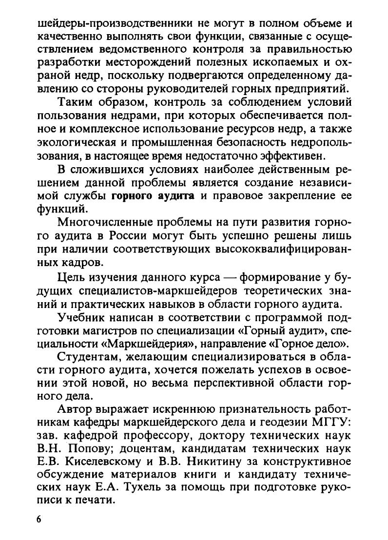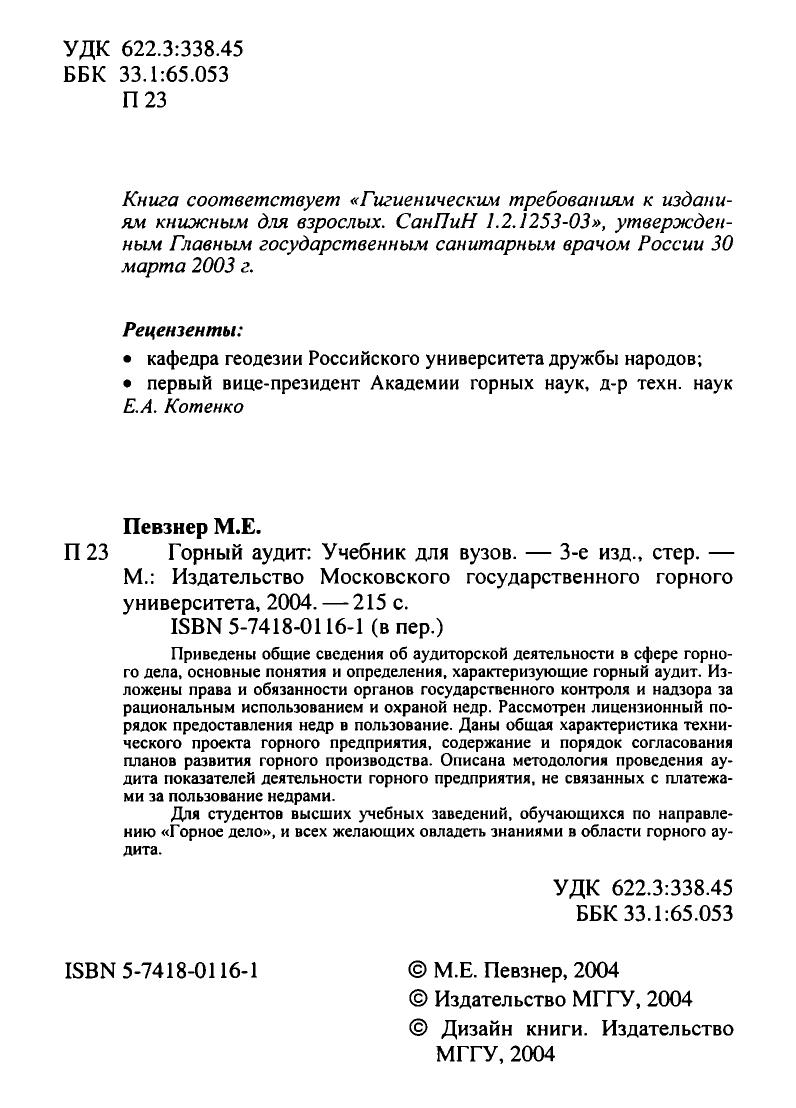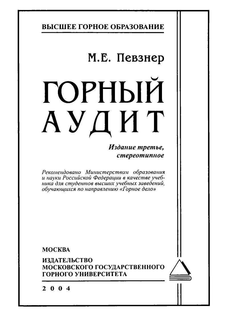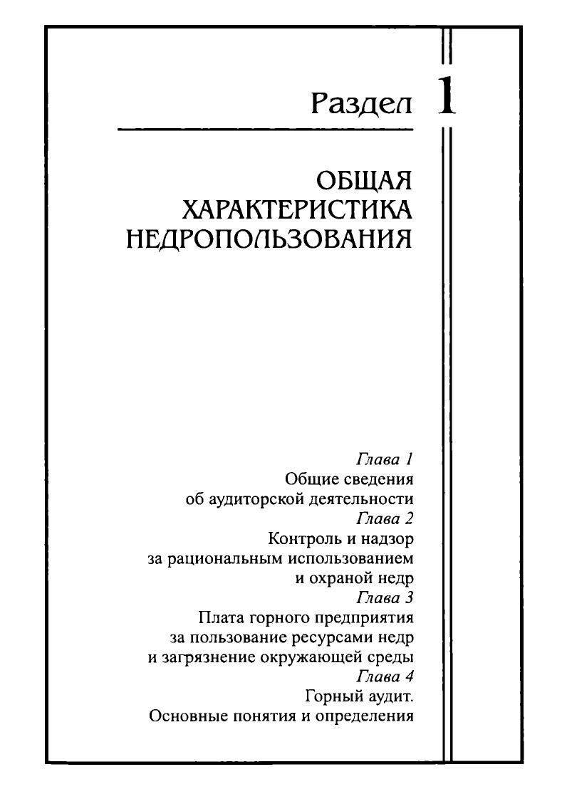 Приведены общие сведения об аудиторской деятельности в сфере горного дела, основные понятия и определения, характеризующие горный аудит. Изложены права и обязанности органов государственного контроля и надзора за рациональным использованием и охраной недр. Рассмотрен лицензионный порядок предоставления недр в пользование. Даны общая характеристика технического проекта горного предприятия, содержание и порядок согласования планов развития горного производства. Описана методология проведения аудита показателей деятельности горного предприятия, не связанных с платежами за пользование недрами. Для студентов высших учебных заведений, обучающихся по направлению «Горное дело», и всех желающих овладеть знаниями в области горного аудита.