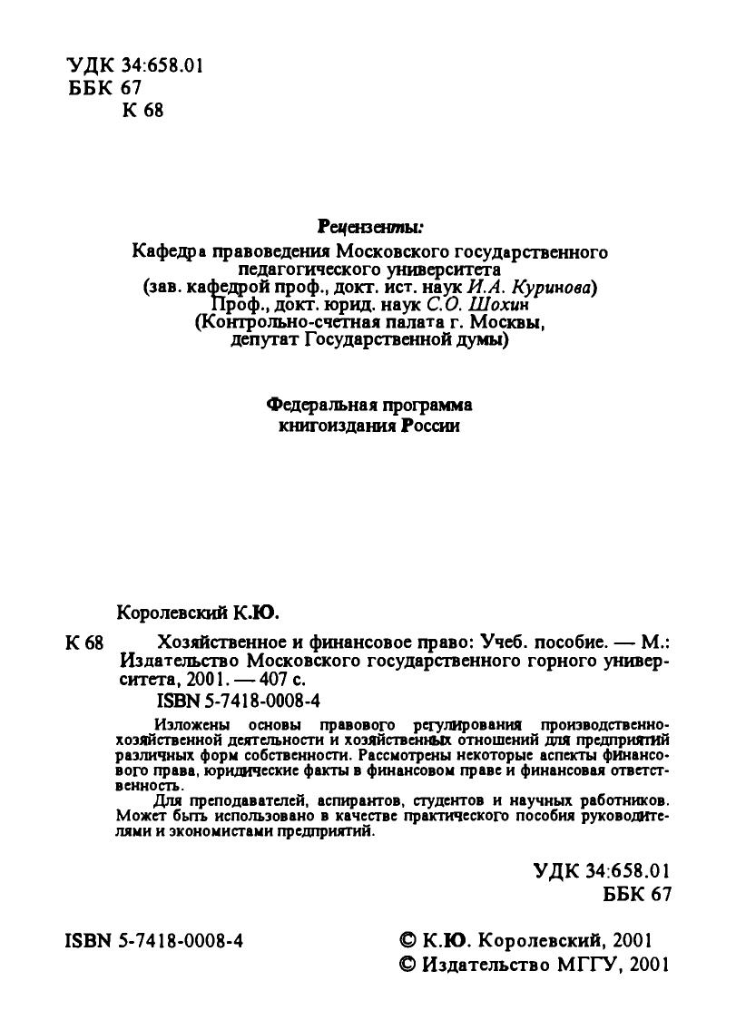Изложены основы правового регулирования производственно-хозяйственной деятельности и хозяйственных отношений для предприятий различных форм собственности. Рассмотрены некоторые аспекты финансового права, юридические факты в финансовом праве и финансовая ответственность. Для преподавателей, аспирантов, студентов и научных работников. Может быть использовано в качестве практического пособия руководителями и экономистами предприятий.