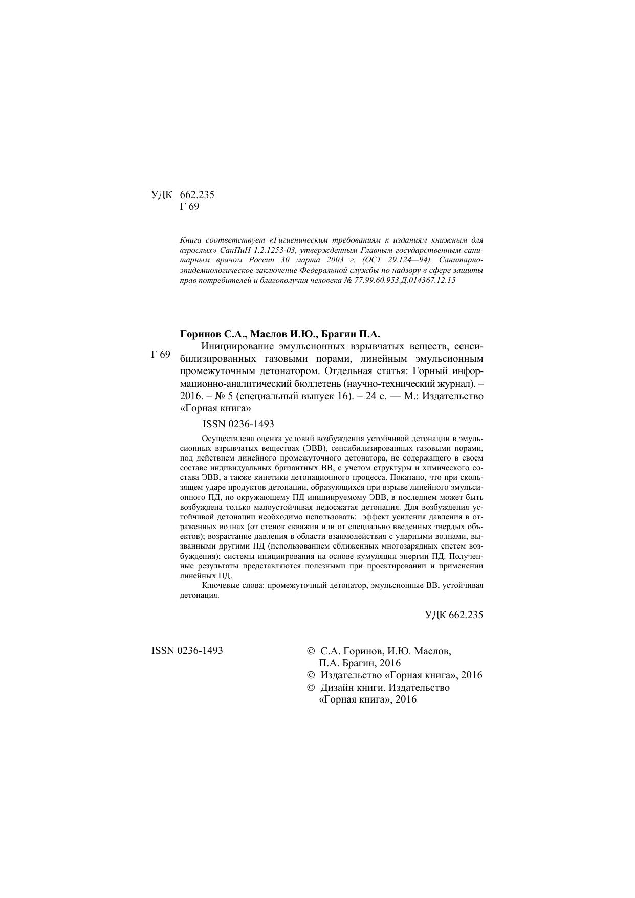 Инициирование эмульсионных взрывчатых веществ, сенсибилизированных газовыми порами, линейным эмульсионным промежуточным детонатором. Отдельная статья: Горный информационно-аналитический бюллетень (научно-технический журнал)