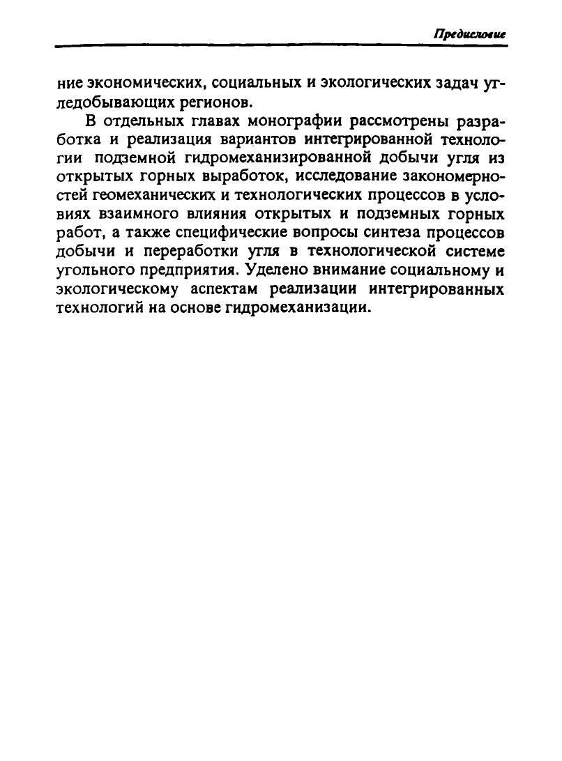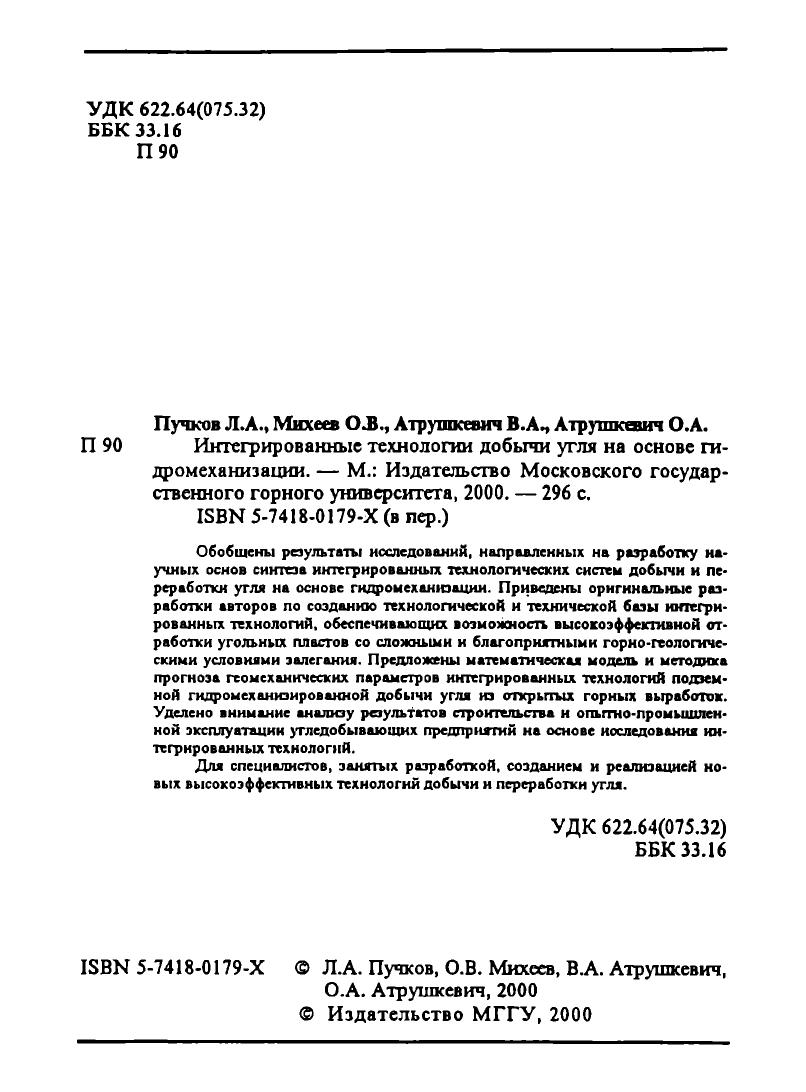 Обобщены результаты исследований, направленных на разработку научных основ синтеза интегрированных технологических систем добычи и переработки угля на основе гидромеханизации. Приведены оригинальные разработки авторов по созданию технологической и технической базы интегрированных технологий, обеспечивающих возможность высокоэффективной отработки угольных пластов со сложными и благоприятными горно-геологическими условиями залегания. Предложены математическая модель и методика прогноза геомеханических параметров интегрированных технологий подземной гидромеханизированной добычи угля из открытых горных выработок. Уделено внимание анализу результатов строительства и опытно-промышленной эксплуатации угледобывающих предприятий на основе исследования интегрированных технологий. Для специалистов, занятых разработкой, созданием и реализацией новых высокоэффективных технологий добычи и переработки угля.