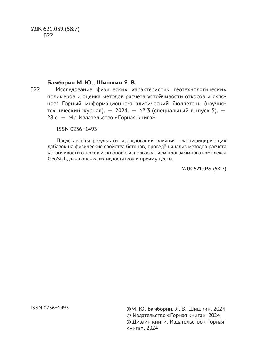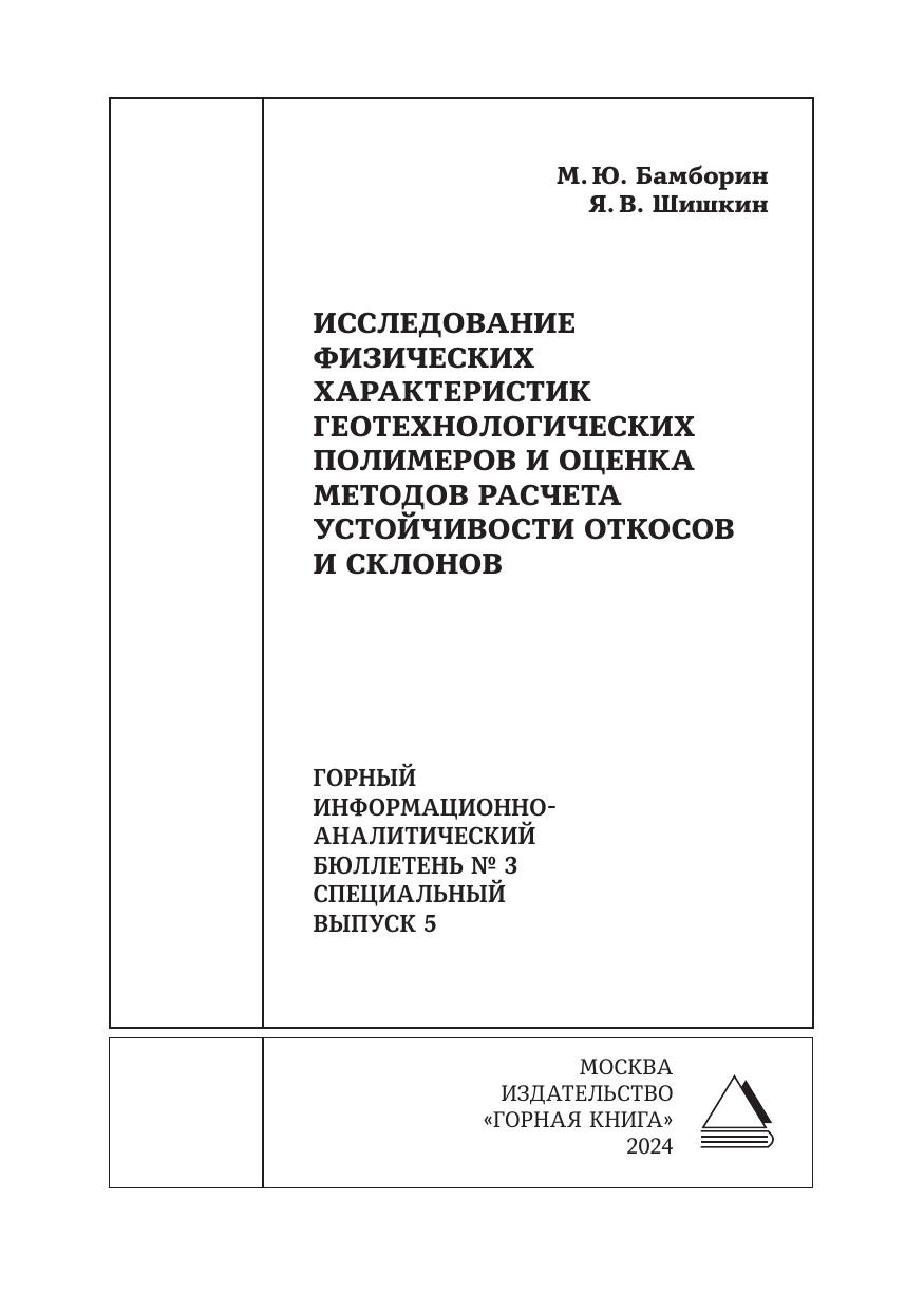Исследование физических характеристик геотехнологических полимеров и оценка методов расчета устойчивости откосов и склонов: горный информационно-аналитический бюллетень № 3. Специальный выпуск 5