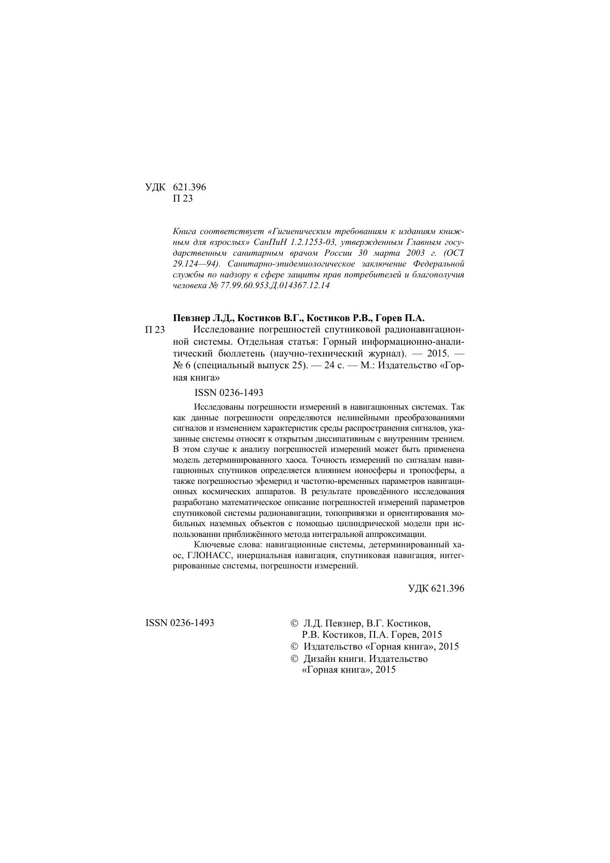 Исследование погрешностей спутниковой радионавигационной системы. Отдельная статья: Горный информационно-аналитический бюллетень (научно-технический журнал)