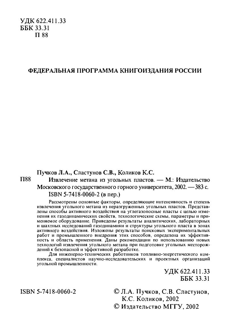 Рассмотрены основные факторы, определяющие интенсивность и степень извлечения угольного метана из неразгруженных угольных пластов. Представлены способы активного воздействия на углегазоносные пласты с целью изменения их газодинамических свойств, технологические схемы, параметры и применяемое оборудование. Приведены результаты аналитических, лабораторных и шахтных исследований газодинамики и структуры угольного пласта в зонах активного воздействия. Изложены результаты поисковых экспериментальных работ и промышленного внедрения этих способов, определена их эффективность и область применения. Даны рекомендации по использованию новых технологий извлечения угольного метана при подготовке угольных месторождений к безопасной и эффективной разработке. Для инженерно-технических работников топливно-энергетического комплекса, специалистов научно-исследовательских и проектных организаций угольной промышленности.