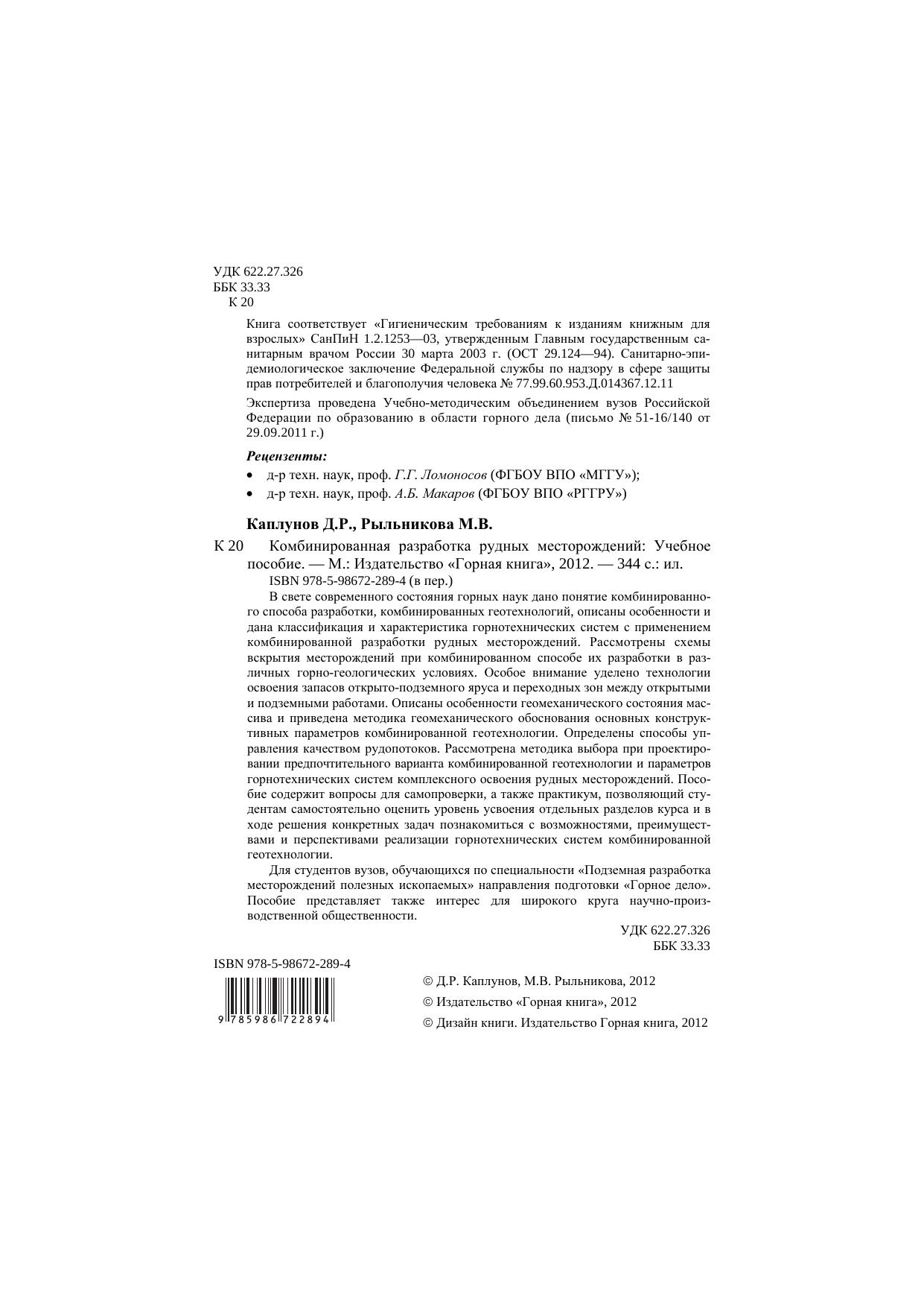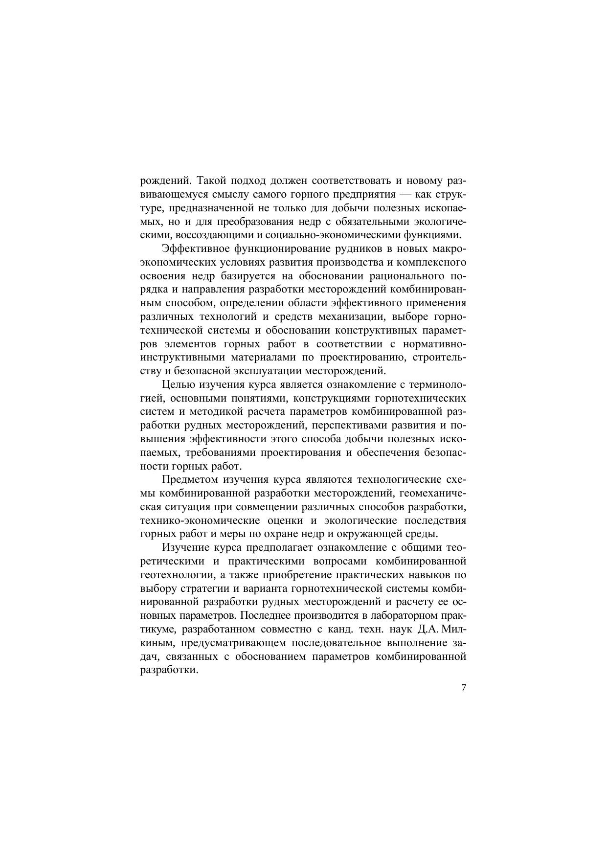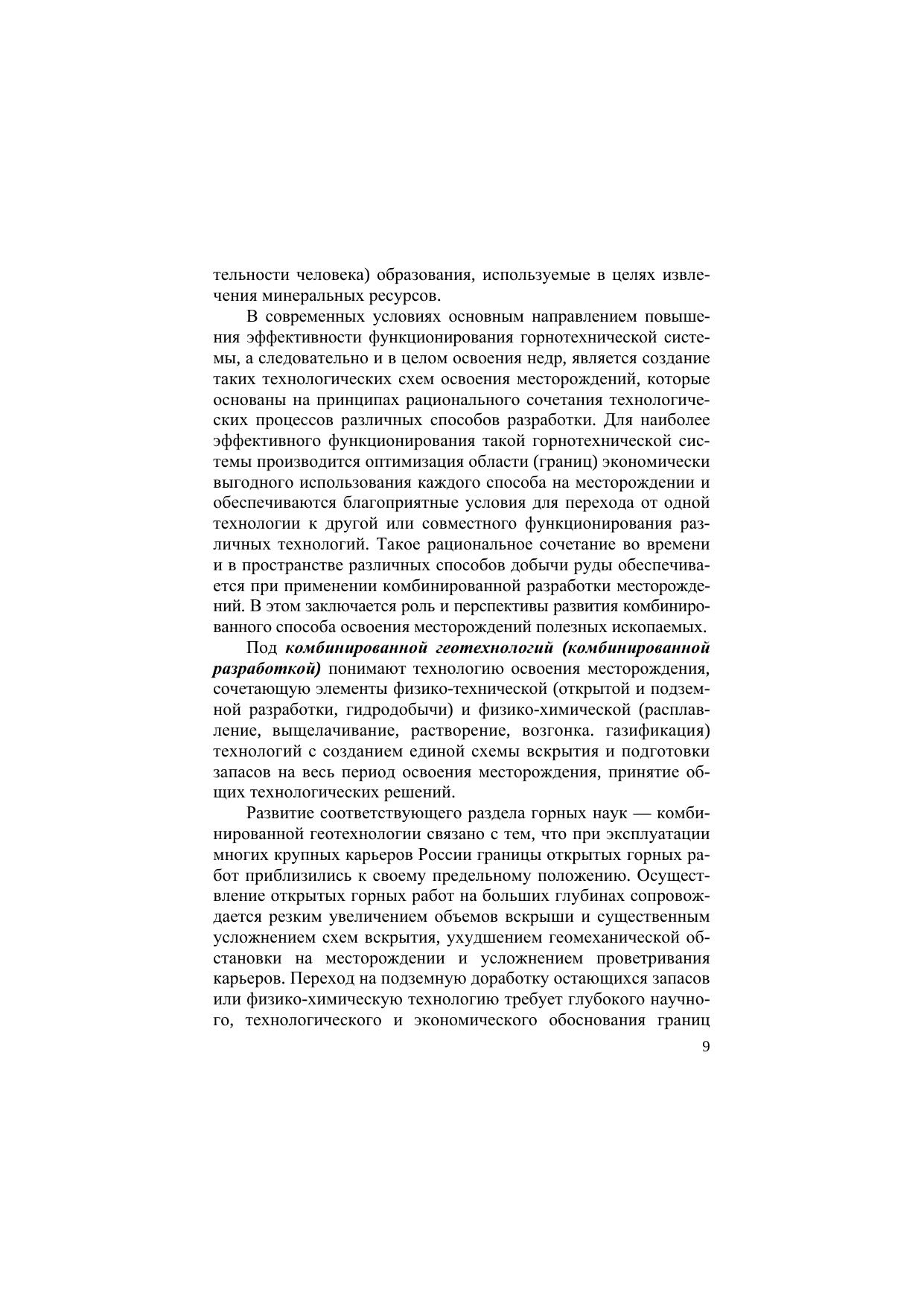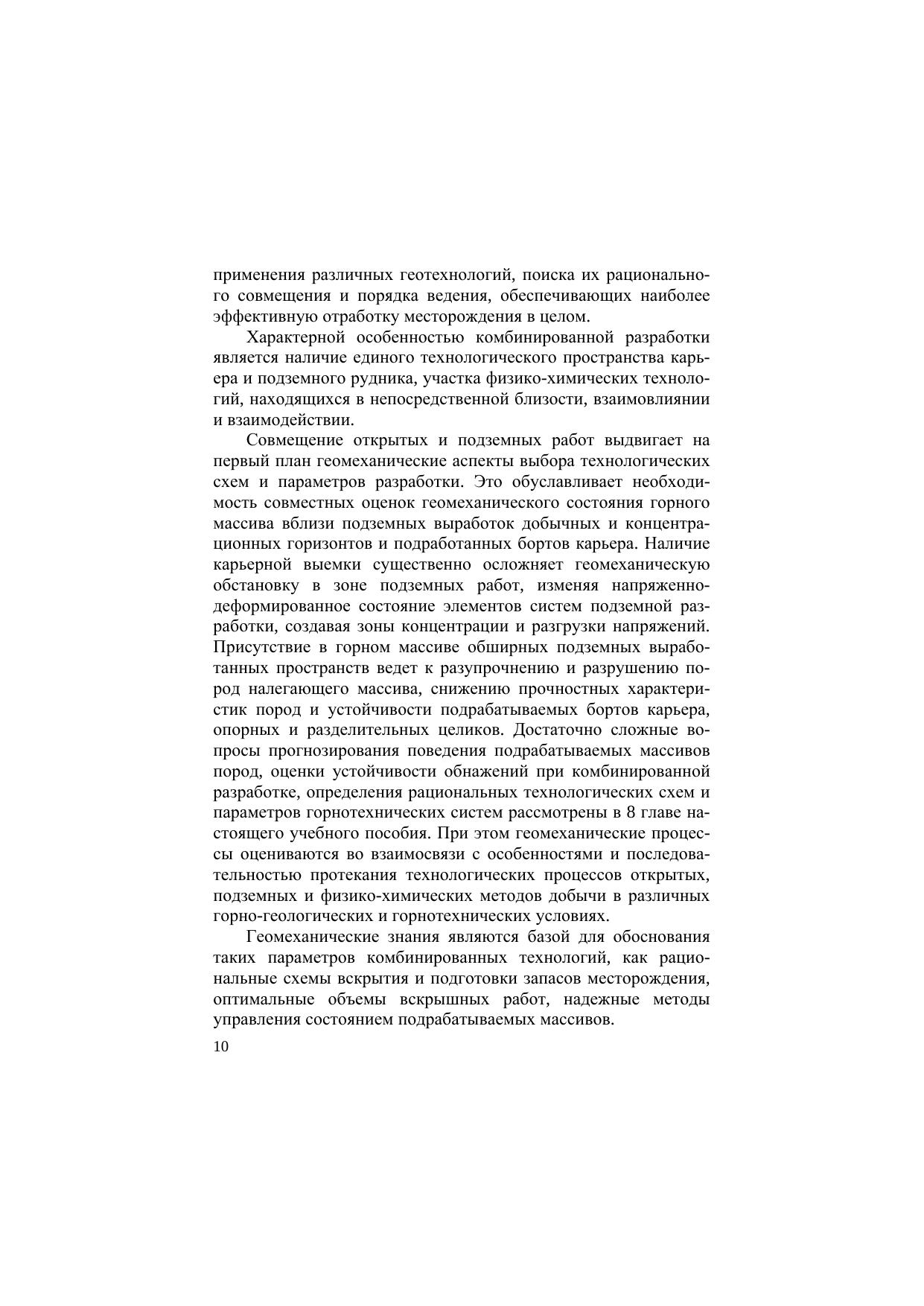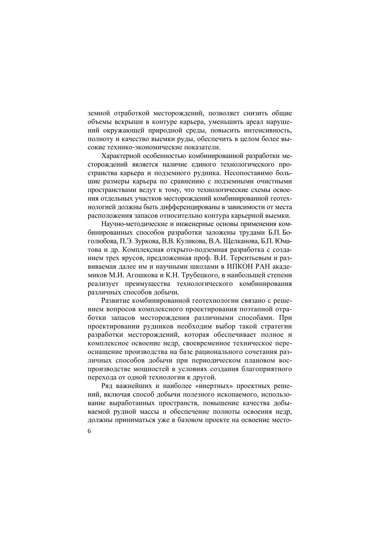 В свете современного состояния горных наук дано понятие комбинированного способа разработки, комбинированных геотехнологий, описаны особенности и дана классификация и характеристика горнотехнических систем с применением комбинированной разработки рудных месторождений. Рассмотрены схемы вскрытия месторождений при комбинированном способе их разработки в различных горно-геологических условиях. Особое внимание уделено технологии освоения запасов открыто-подземного яруса и переходных зон между открытыми и подземными работами. Описаны особенности геомеханического состояния массива и приведена методика геомеханического обоснования основных конструктивных параметров комбинированной геотехнологии. Определены способы управления качеством рудопотоков. Рассмотрена методика выбора при проектировании предпочтительного варианта комбинированной геотехнологии и параметров горнотехнических систем комплексного освоения рудных месторождений. Пособие содержит вопросы для самопроверки, а также практикум, позволяющий студентам самостоятельно оценить уровень усвоения отдельных разделов курса и в ходе решения конкретных задач познакомиться с возможностями, преимуществами и перспективами реализации горнотехнических систем комбинированной геотехнологии. Для студентов вузов, обучающихся по специальности «Подземная разработка месторождений полезных ископаемых» направления подготовки «Горное дело». Пособие представляет также интерес для широкого круга научно-производственной общественности.