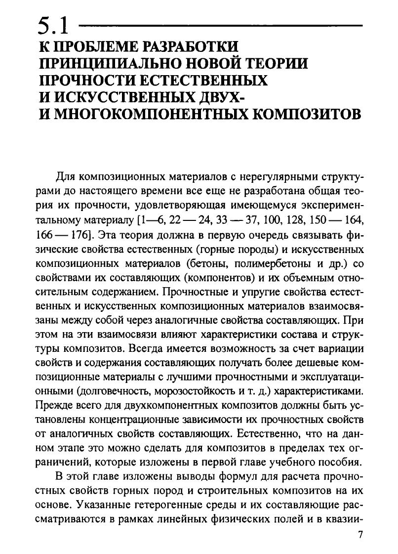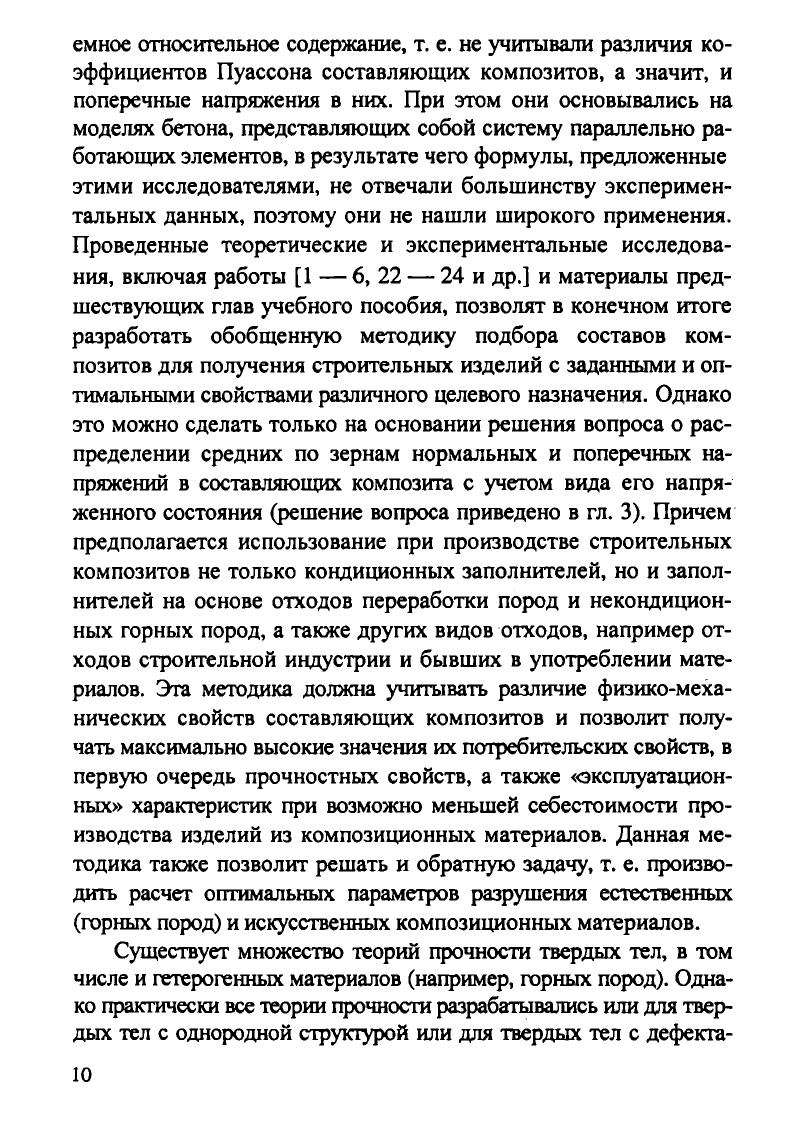 Изложена сущность формирования прочностных свойств двух- и многокомпонентных естественных и искусственных строительных композитов на основе минеральных заполнителей из горных пород и отходов различных производств с применением неорганических, органических и других типов связующих. Впервые уделено внимание влиянию не только продольных, но и поперечных напряжений в составляющих на прочностные свойства композитов. Рассмотрено влияние внутренних напряжений на прочностные свойства композитов. Дана классификация искусственных строительных композитов по характеру разрушения их составляющих. Приведены исходная база данных свойств составляющих композитов, методики и примеры расчетов комплекса физических и прочностных свойств горных пород, тяжелых, легких бетонов, полимербетонов и других композитов. Для студентов вузов, обучающихся по специальности «Открытые горные работы» направления подготовки «Горное дело». Может быть полезна аспирантам, а также специалистам, занятым в строительной и горно-добывающей промышленности.