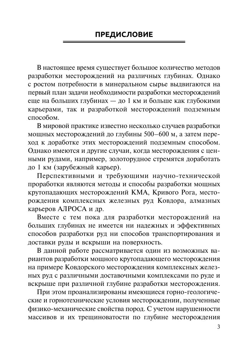 В концепции приведены результаты научных проработок способов разработки месторождений ценных руд с 2–3 полезными компонентами на больших глубинах открытым способом, как новый этап создания новых глубоких и суперглубоких карьеров в связи с возрастающей потребностью в минеральном сырье и металлах. Основное внимание обращено на необходимость применения более производительных доставочных комплексов по руде и вскрыше на поверхность и далее к местам складирования или переработки. В обоснованных по прочностным свойствам контурах карьера с дифференцированными углами откосов бортов в верхней, средней и глубокой зонах предложено применять свои производительные доставочные комплексы. С увеличением глубины это автомобильный транспорт, конвейерные и наклонные скиповые подъемники, в глубоких зонах — вертикальный о скиповой подъем и крутонаклонные конвейера. Предлагаемые технические решения подкреплены оценкой возникающих затрат на осуществление способов. Предлагаемые для рассмотрения и использования способы разработки рудных тел и технические решения могут быть полезны при строительстве как глубоких, так и не глубоких карьеров.