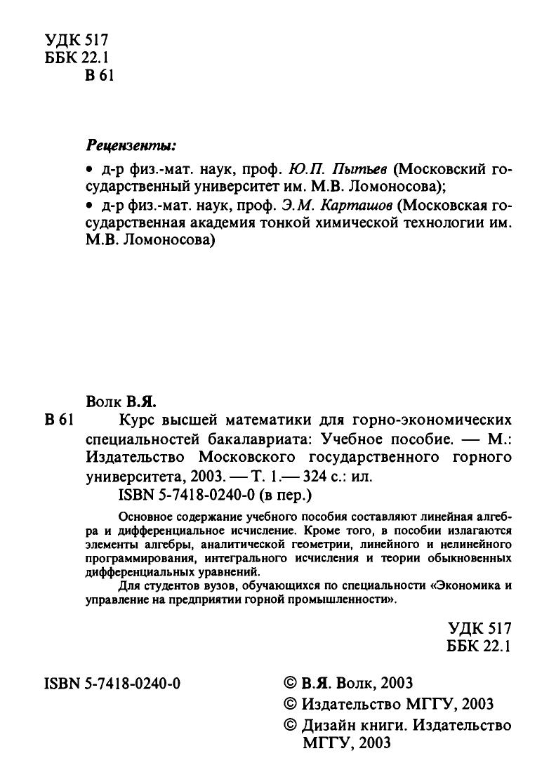 Основное содержание учебного пособия составляют линейная алгебра и дифференциальное исчисление. Кроме того, в пособии излагаются элементы алгебры, аналитической геометрии, линейного и нелинейного программирования, интегрального исчисления и теории обыкновенных дифференциальных уравнений. Для студентов вузов, обучающихся по специальности «Экономика и управление на предприятии горной промышленности».