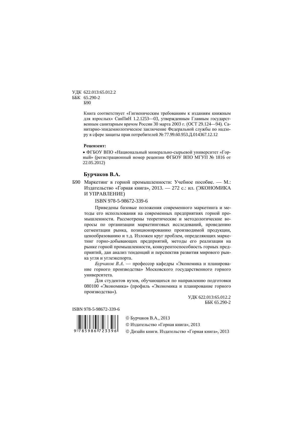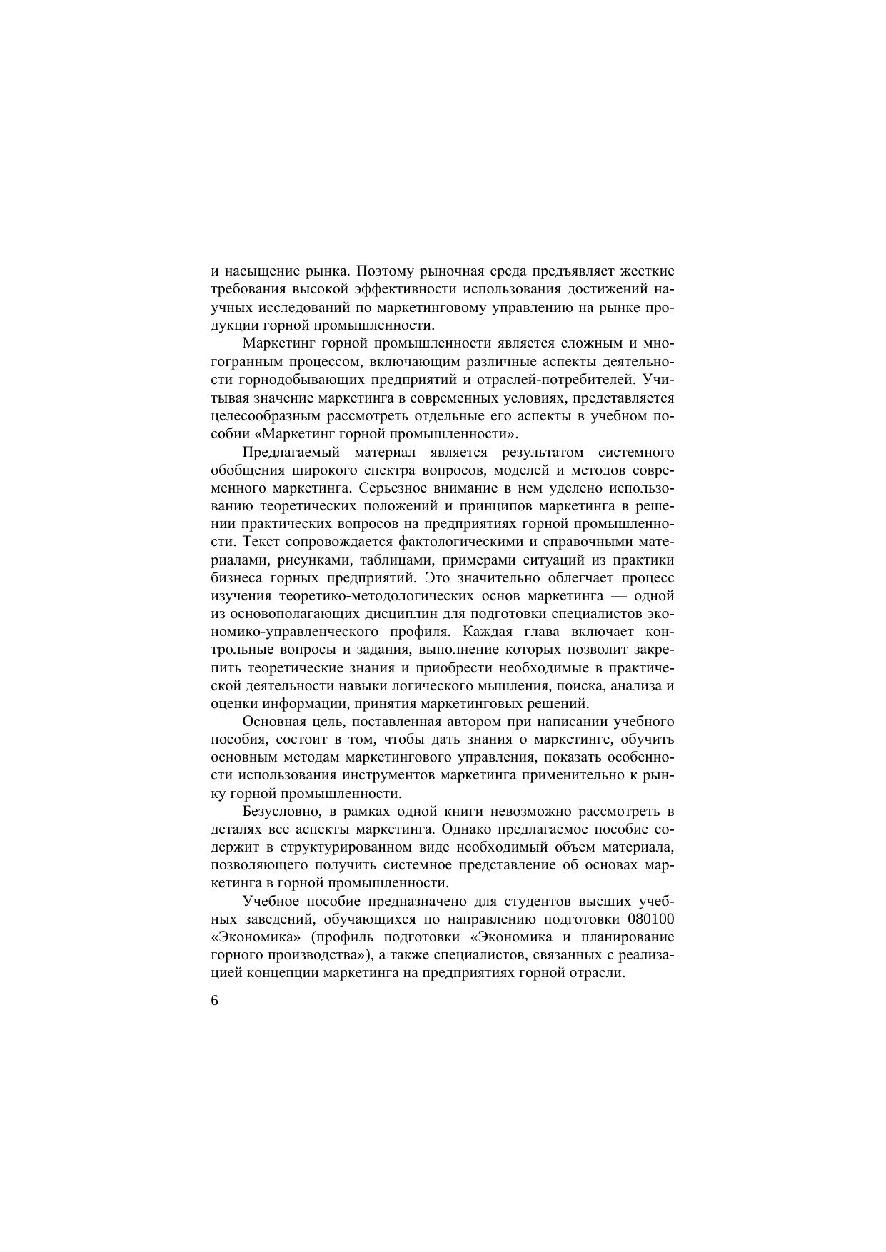 Приведены базовые положения современного маркетинга и методы его использования на современных предприятиях горной промышленности. Рассмотрены теоретические и методологические вопросы по организации маркетинговых исследований, проведению сегментации рынка, позиционированию производимой продукции, ценообразованию и т.д. Изложен круг проблем, определяющих маркетинг горно-добывающих предприятий, методы его реализации на рынке горной промышленности, конкурентоспособность горных предприятий, дан анализ тенденций и перспектив развития мирового рынка угля и углеэкспорта. Бурчаков В.А. — профессор кафедры «Экономика и планирование горного производства» Московского государственного горного университета. Для студентов вузов, обучающихся по направлению подготовки 080100 «Экономика» (профиль «Экономика и планирование горного производства»).