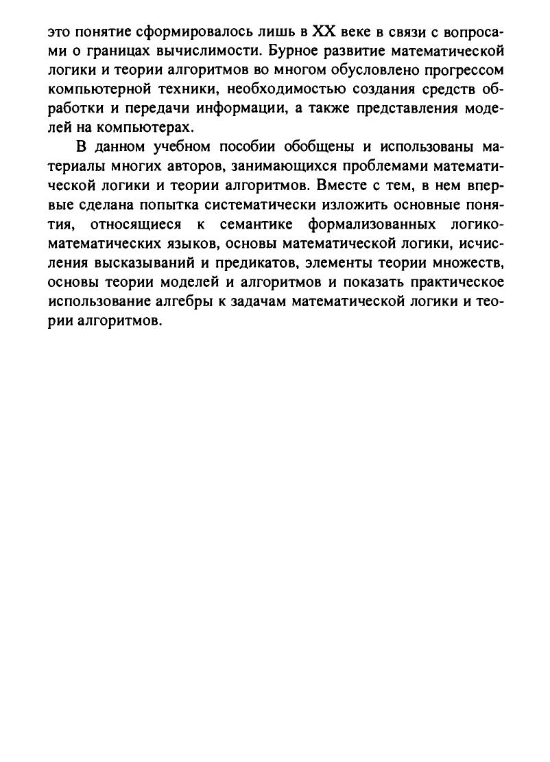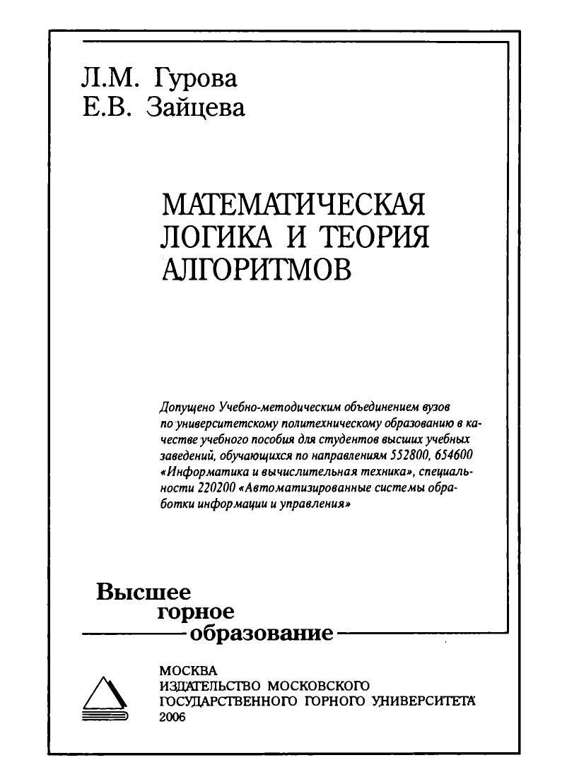 Изложен материал основного курса «Математическая логика и теория алго¬ритмов», читаемого на факультете «Автоматизации и информатики (АИ)» МГГУ: основные понятия, относящиеся к семантике формализованных логико-математических языков математическая логика, исчисление высказываний и предикатов, элементы теории множеств, основы теории моделей и алгоритмов. Показано практическое использование алгебры к задачам математической логики. Для студентов вузов, обучающихся по направлениям 552800, 654600 «Информатика и вычислительная техника», специальности 220200 «Автоматизированные системы обработки информации и управления».