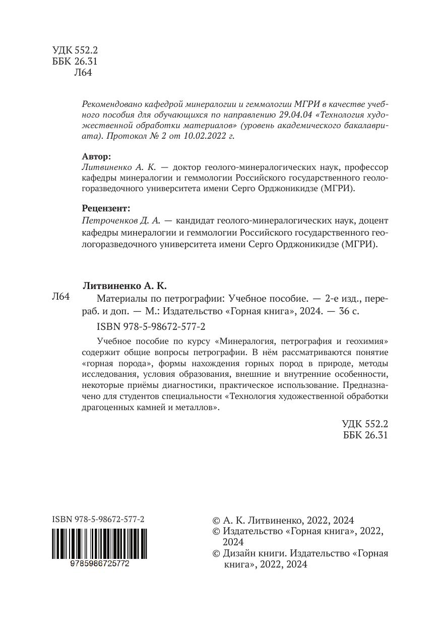 Учебное пособие по курсу «Минералогия, петрография и геохимия» содержит общие вопросы петрографии. В нём рассматриваются понятие «горная порода», формы нахождения горных пород в природе, методы исследования, условия образования, внешние и внутренние особенности, некоторые приёмы диагностики, практическое использование. Предназначено для студентов специальности «Технология художественной обработки драгоценных камней и металлов».