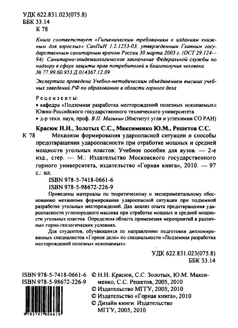 Гриф: Допущено Учебно-методически.м объединением вузов Российской Федерации по образованию в области горного дела в качестве учебного пособия для студентов вузов, обучающихся по направлению подготовки диплаwированных специалистов "Горное дело" по специальности "Подземная разработка месторождений полезных ископаемых"