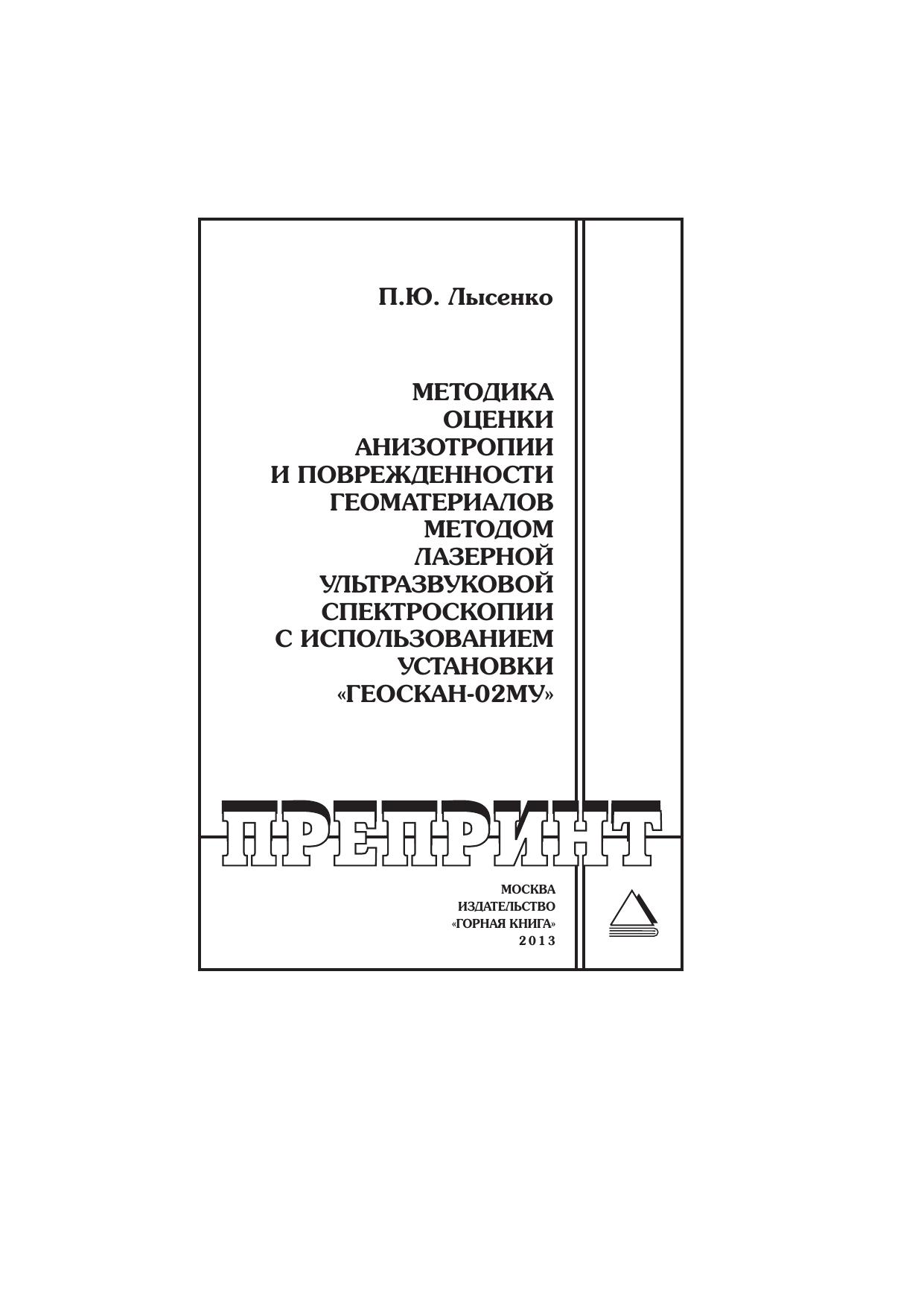Представлены сведения о закономерностях генерации упругих волн в результате термоупругого эффекта в геоматериалах. Описаны принцип действия и основные технические характеристики лазерного ультразвукового структуроскопа «Геоскан-02МУ». Изложена методика проведения измерений поврежденности и анизотропии с использованием указанной аппаратуры на образцах горных пород. Для студентов, аспирантов и научно-технических работников, занимающихся неразрушающим контролем твердых материалов.