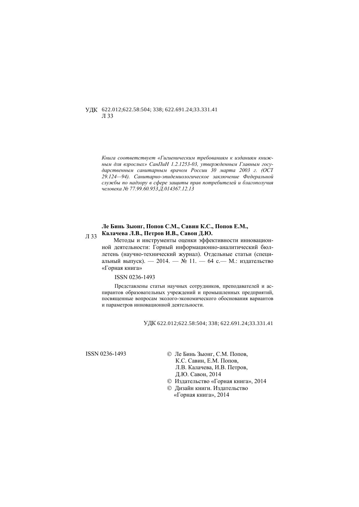 Методы и инструменты оценки эффективности инновационной деятельности: Горный информационно-аналитический бюллетень (научно-технический журнал). Отдельные статьи (специальный выпуск)
