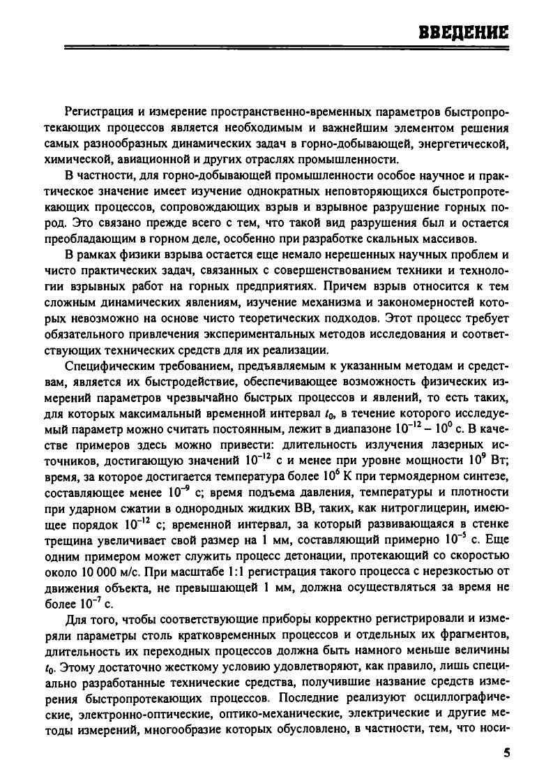 Изложены вопросы методического и аппаратурного обеспечения регистрации и измерения параметров быстропротекающих процессов, сопровождающих взрывное разрушение горных пород. Рассмотрены основные закономерности формирования и распространения упругих колебаний и волн, используемые для экспериментального исследования явления взрыва, механизмов и последствий его воздействий на окружающую среду. Описаны методы и технические средства измерения параметров быстро-протекающих процессов во временной и спектральной областях на основе электрических измерений неэлектрических величин, а также способы изучения указанных процессов с использованием высокоскоростной фотографии и кинематографии. Для студентов вузов, обучающихся по специальности «Взрывное дело» направления подготовки дипломированных специалистов «Горное дело». Может быть рекомендован также научным и инженерно-техническим работникам, занимающимся вопросами измерения и контроля в горном деле.