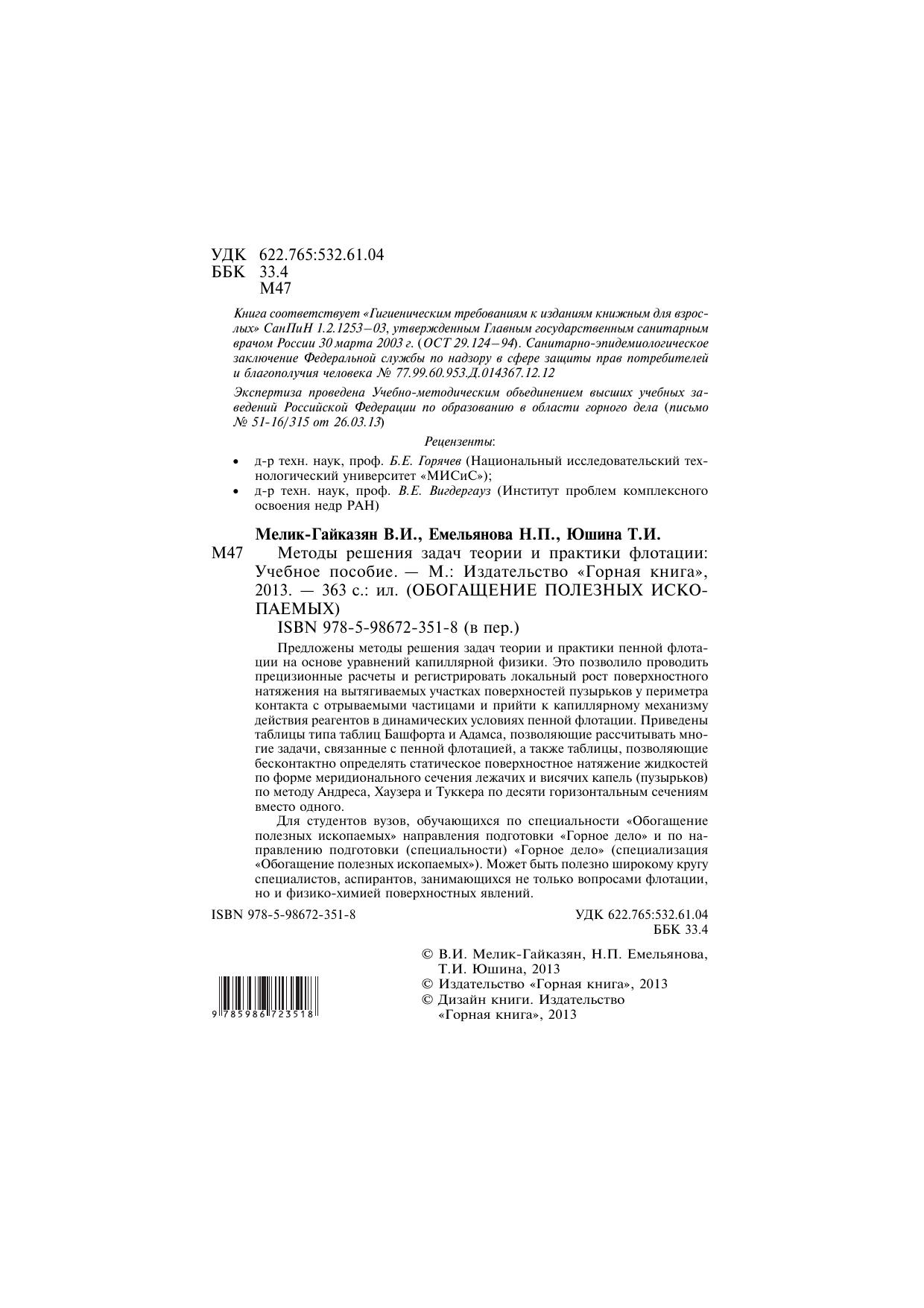 Предложены методы решения задач теории и практики пенной флотации на основе уравнений капиллярной физики. Это позволило проводить прецизионные расчеты и регистрировать локальный рост поверхностного натяжения на вытягиваемых участках поверхностей пузырьков у периметра контакта с отрываемыми частицами и прийти к капиллярному механизму действия реагентов в динамических условиях пенной флотации. Приведены таблицы типа таблиц Башфорта и Адамса, позволяющие рассчитывать многие задачи, связанные с пенной флота цией, а также таблицы, позволяющие бесконтактно определять статическое поверхностное натяжение жидкостей по форме меридионального сечения лежачих и висячих капель (пузырьков) по методу Андреса, Хаузера и Туккера по десяти горизонтальным сечениям вместо одного. Для студентов вузов, обучающихся по специальности «Обогащение полезных ископаемых» направления подготовки «Горное дело» и по направлению подготовки (специальности) «Горное дело» (специализация «Обогащение полезных ископаемых»). Может быть полезно широкому кругу специалистов, аспирантов, занимающихся не только вопросами флотации, но и физико-химией поверхностных явлений.