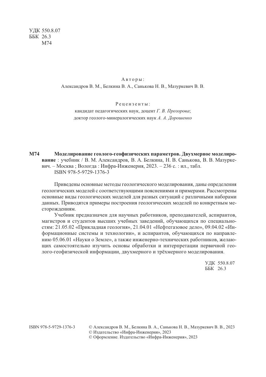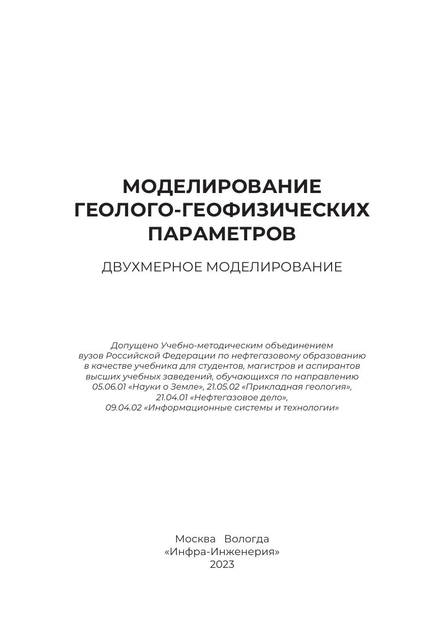 Учебник предназначен для научных работников, преподавателей, аспирантов, магистров и студентов высших учебных заведений, обучающихся по специальностям: 21.05.02 «Прикладная геология», 21.04.01 «Нефтегазовое дело», 09.04.02 «Информационные системы и технологии», и аспирантов, обучающихся по направлению 05.06.01 «Науки о Земле», а также инженерно-технических работников, желающих самостоятельно изучить основы обработки и интерпретации первичной геолого-геофизической информации, двухмерного и трёхмерного моделирования.