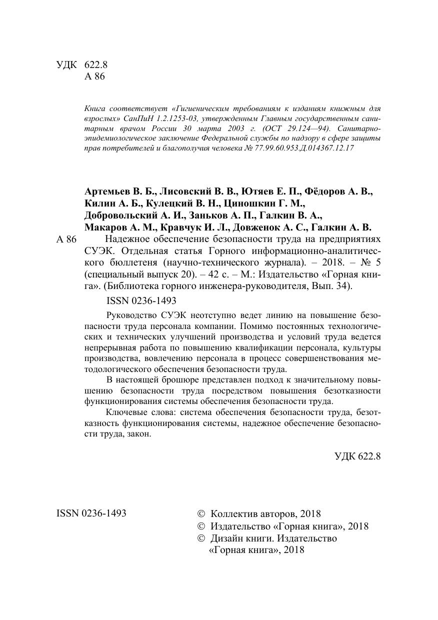 Надежное обеспечение безопасности труда на предприятиях СУЭК. Отдельная статья Горного информационно-аналитического бюллетеня (научно-технического журнала). № 5
